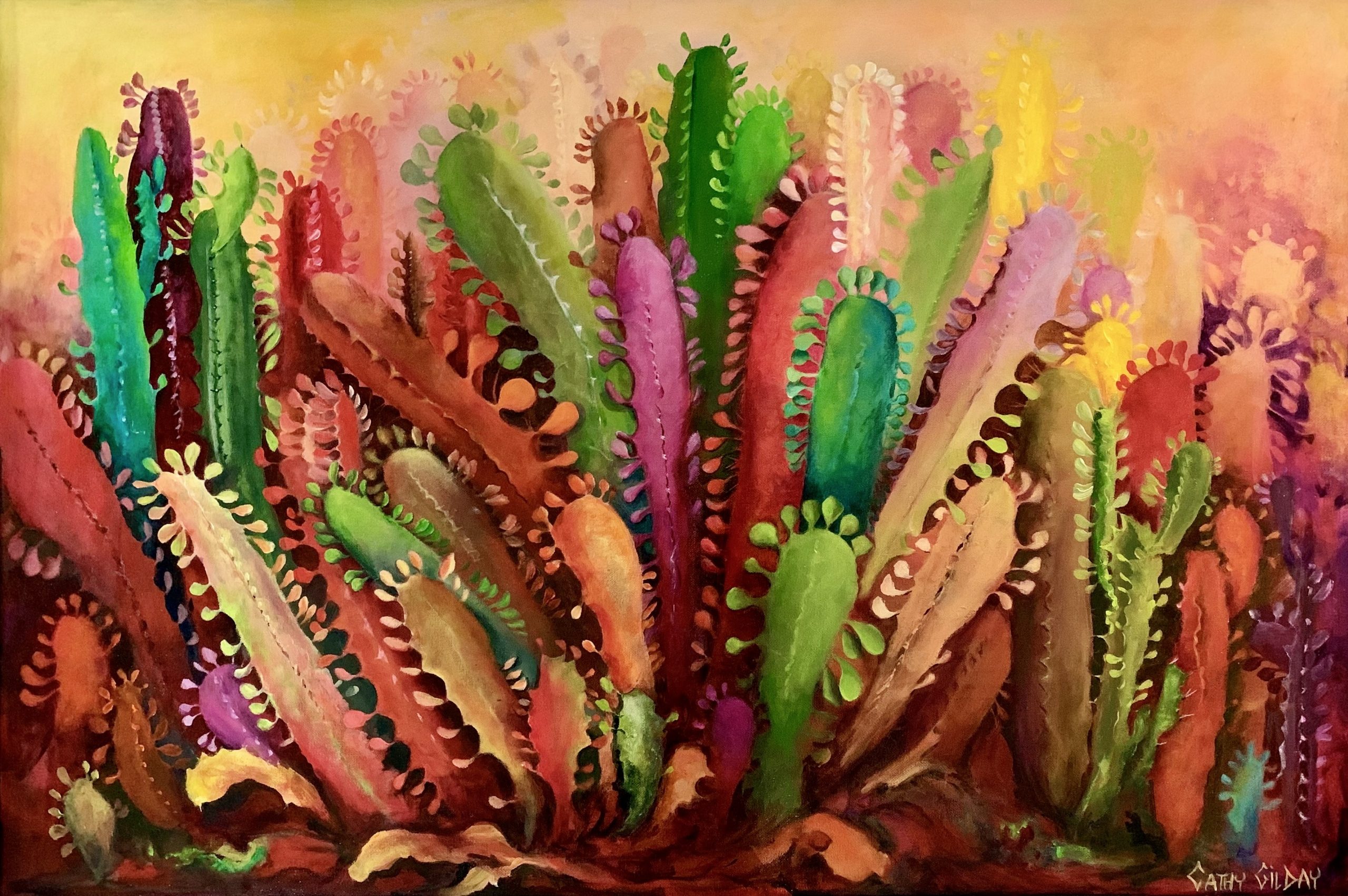 I was inspired to create this painting for two reasons. The first was because I have had a pot of the ‘Candelabra Cactus,’ also known as the ‘African Milk Tree,’  growing in my garden for many years. It always reminds me of a  group of people standing together, with the odd little one on their shoulders. Secondly, the colours of the foliage, are so bright and spectacular, it can easily make you forget that their thorns can be very spiteful. I can’t resist exaggerating the colours, as I think it gives each leaf an individual personality.  Framed and Ready to hang.