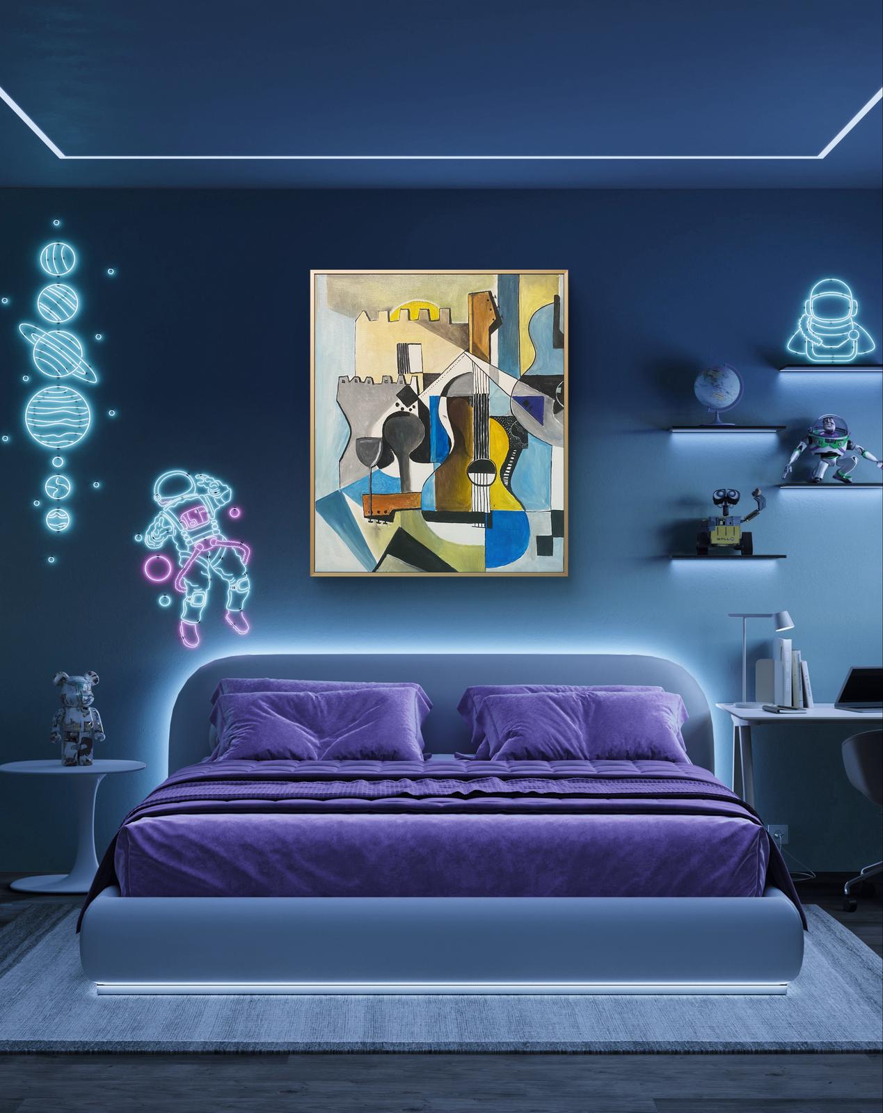 I pay homage to the spirit of Picasso through a bold and imaginative composition that merges music, architecture, and human expression. Fragmented yet harmonious, the piece features abstract representations of musical instruments, a castle bathed in warm sunlight, and silhouettes of human forms—all layered with geometric precision and vibrant contrast.