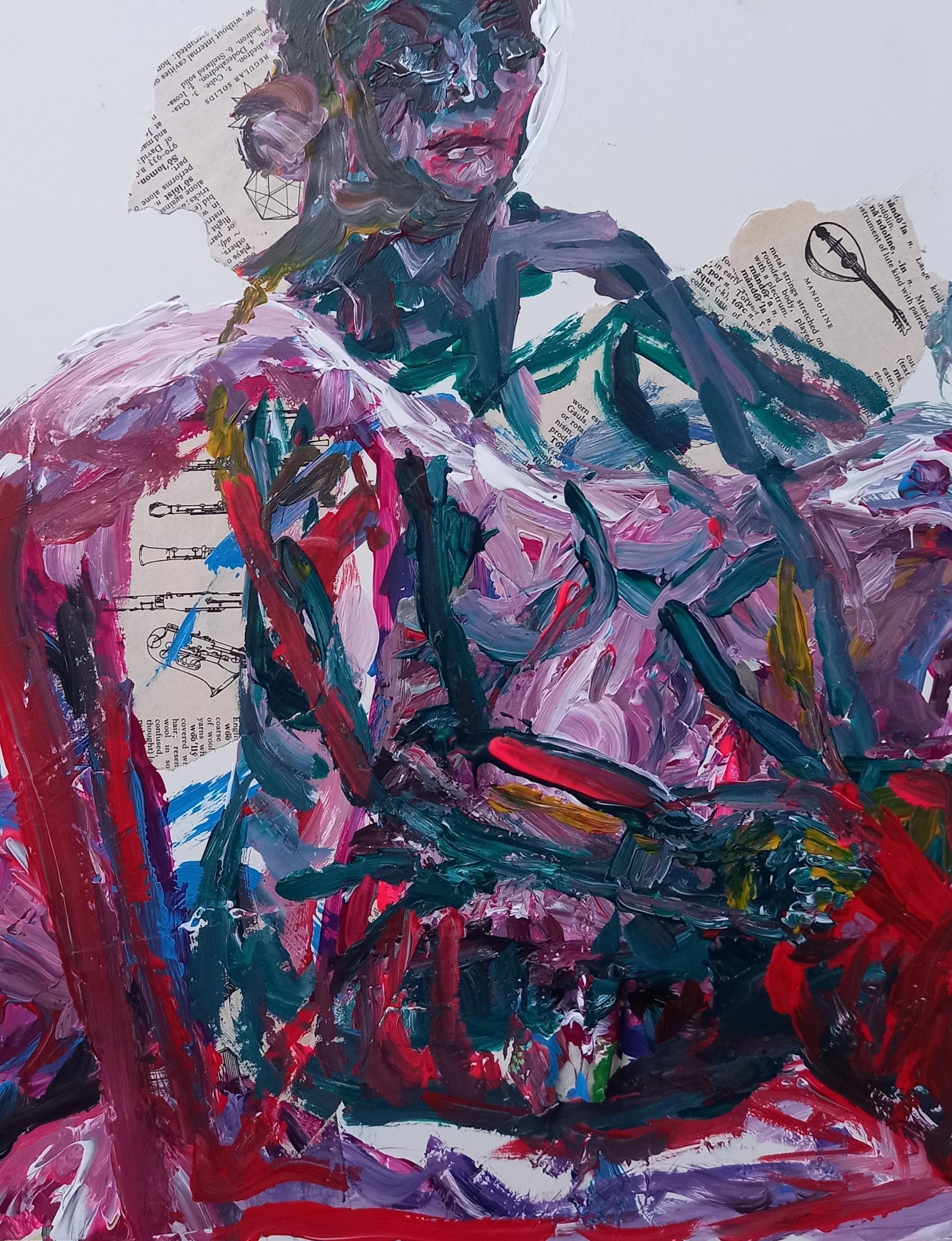 Collage including pages of an old dictionary, some painted three dimesional collage adding a lovely dynamic. Juxtaposed this with figure painting and abstracted brushstrokes. The chemistry of this multimedia piece has built up into an exciting, emotive and psychological expressionist piece of art. On a strong multimedia claybord surface. Finished in vanish for preservation.