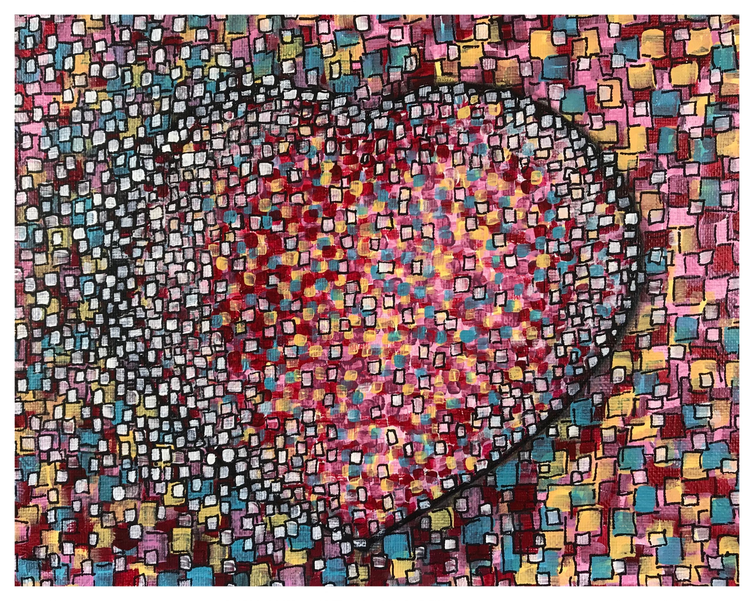 Acrylic paint applied using a brush for the base and then hand drawn lines using an acrylic pen added. Each brush stroke is used as the shape to draw the lines. Lots of squares and lines. A heart breaking up at the side or coming together to form the shape.