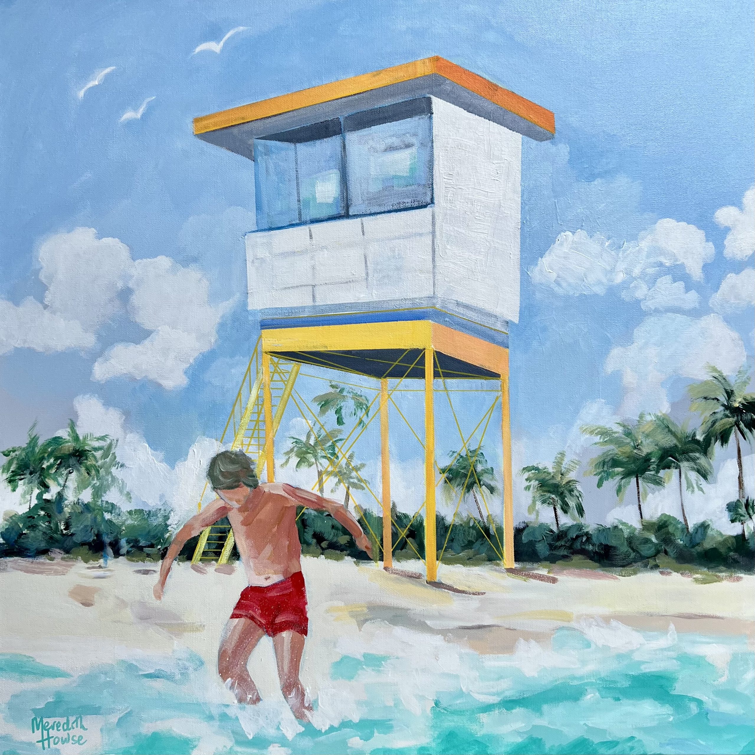 The painting portrays a teen feeling the cool crisp splash of water, a lifeguard tower sits behind.