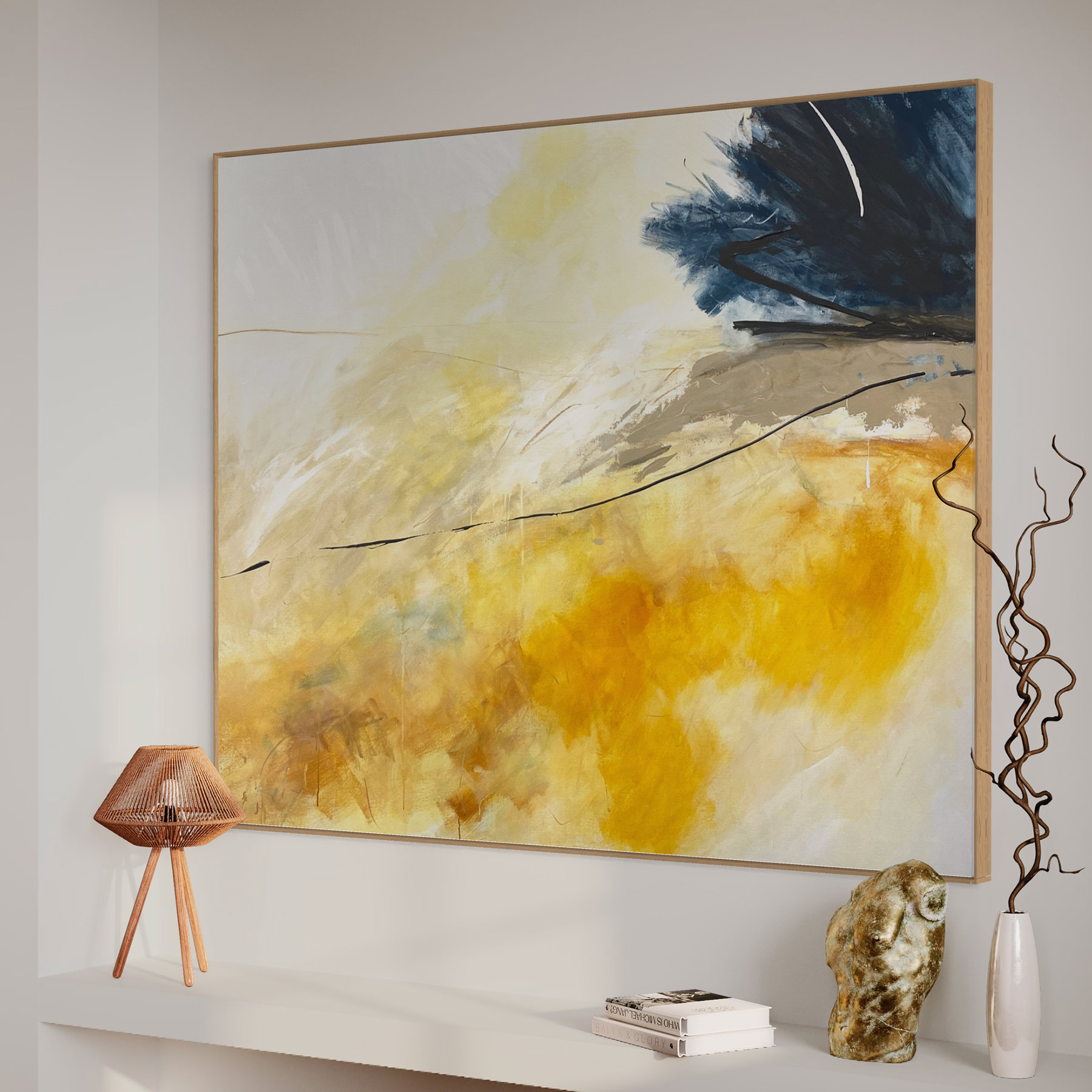 This large painting has areas of texture and a subtle palette of beige, ochre, lemon, white, black, blue, and grey with dramatic marks in paint across the canvas surface.