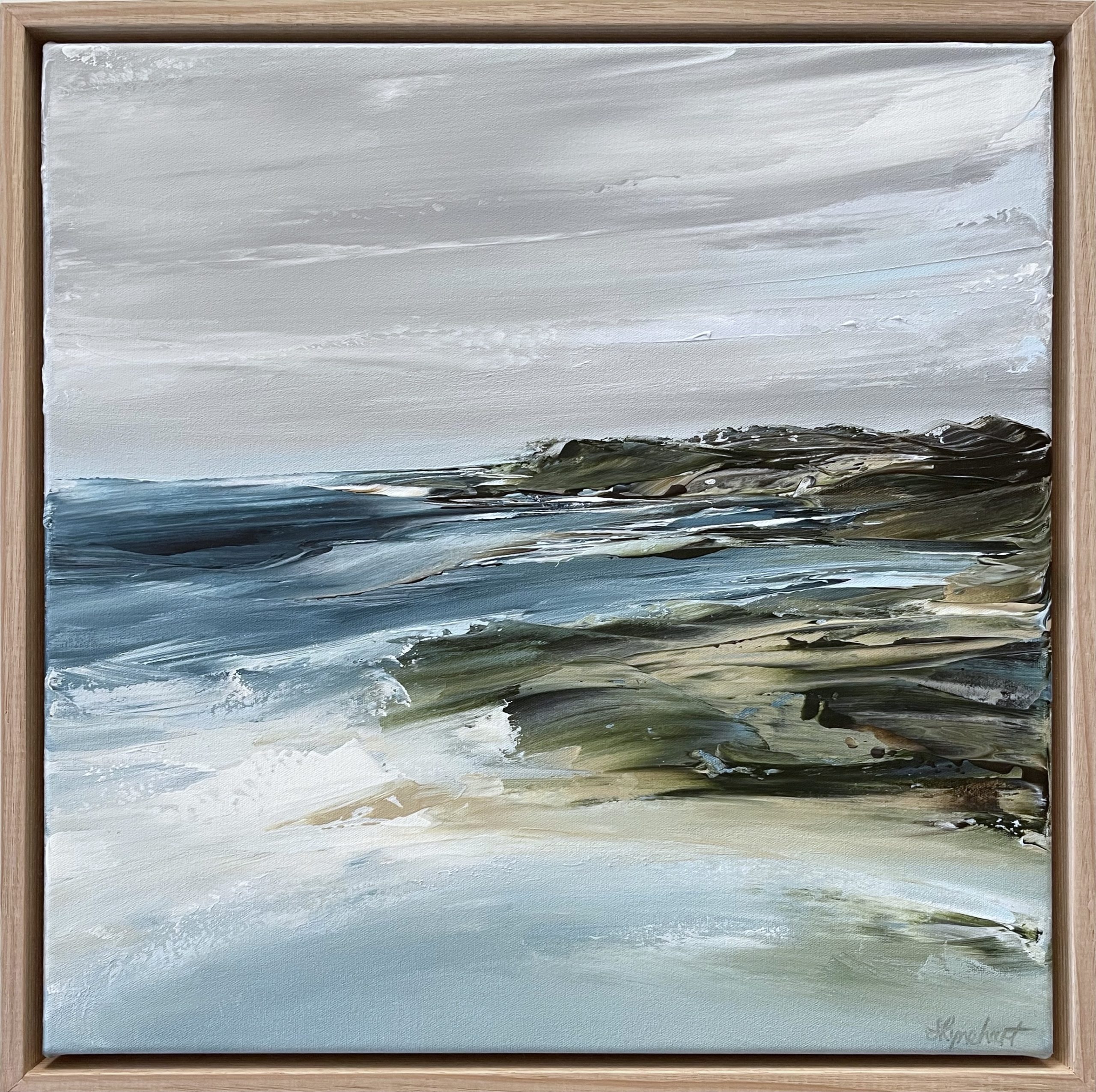 This moody seascape of blues and greens and greys and sand is painted with a palette knife on artist quality stretched canvas. It is framed in a solid oak timber frame, satin varnished, and will come with a COA.