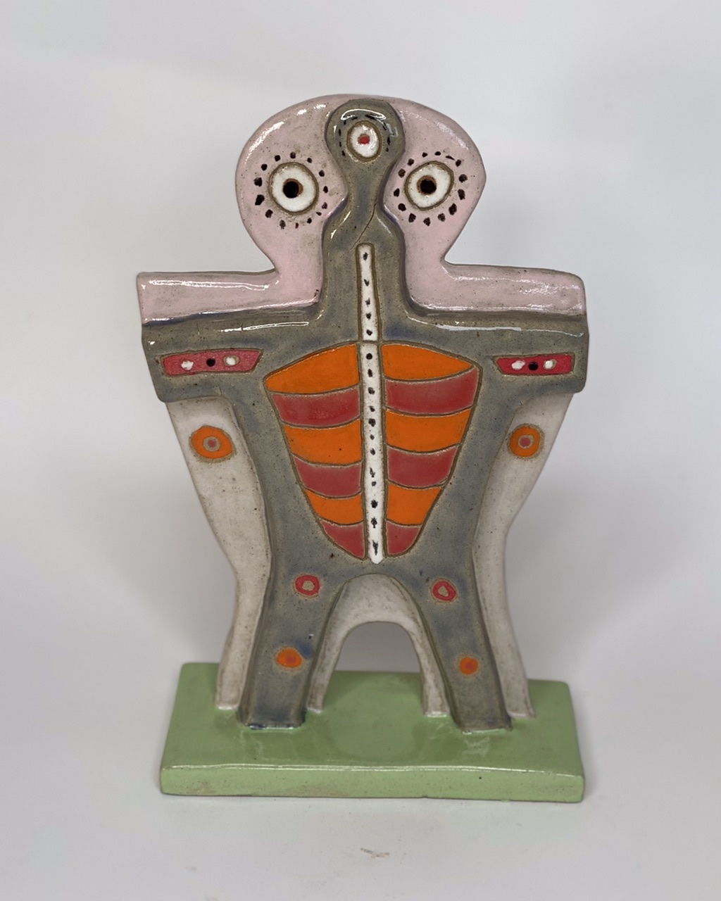 Take Me to Your Leader by Stefan Mager – Spirit sculpture. Brightly glazed, great colour combinations. This sculpture brings satisfaction and pleasure. Research has shown sculptures to provide higher emotional support than paintings. Unlike paintings limited to two dimensions, the sculpture reflects life in three-dimensional space. Sculpture inhabits the space shared by the viewer. Sculptures are tactile, one can touch them and feel their texture, weight and shape. The sculpture has a surprise function that can trigger pleasant psychological arousal resulting in a profoundly satisfying and genuinely invigorating aesthetic experience.