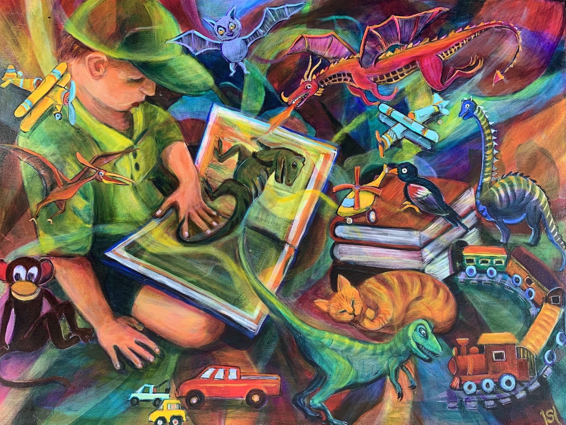 I took a photo of a child reading an illustrated book at a sports carnival.  The little boy was totally absorbed in his book and completely oblivious to the shouting and cheering and crowd activity around him, which led me to thinking about this composition. The background colours are btight swirling abstract patterns interlinked with the toys and books around the boy.