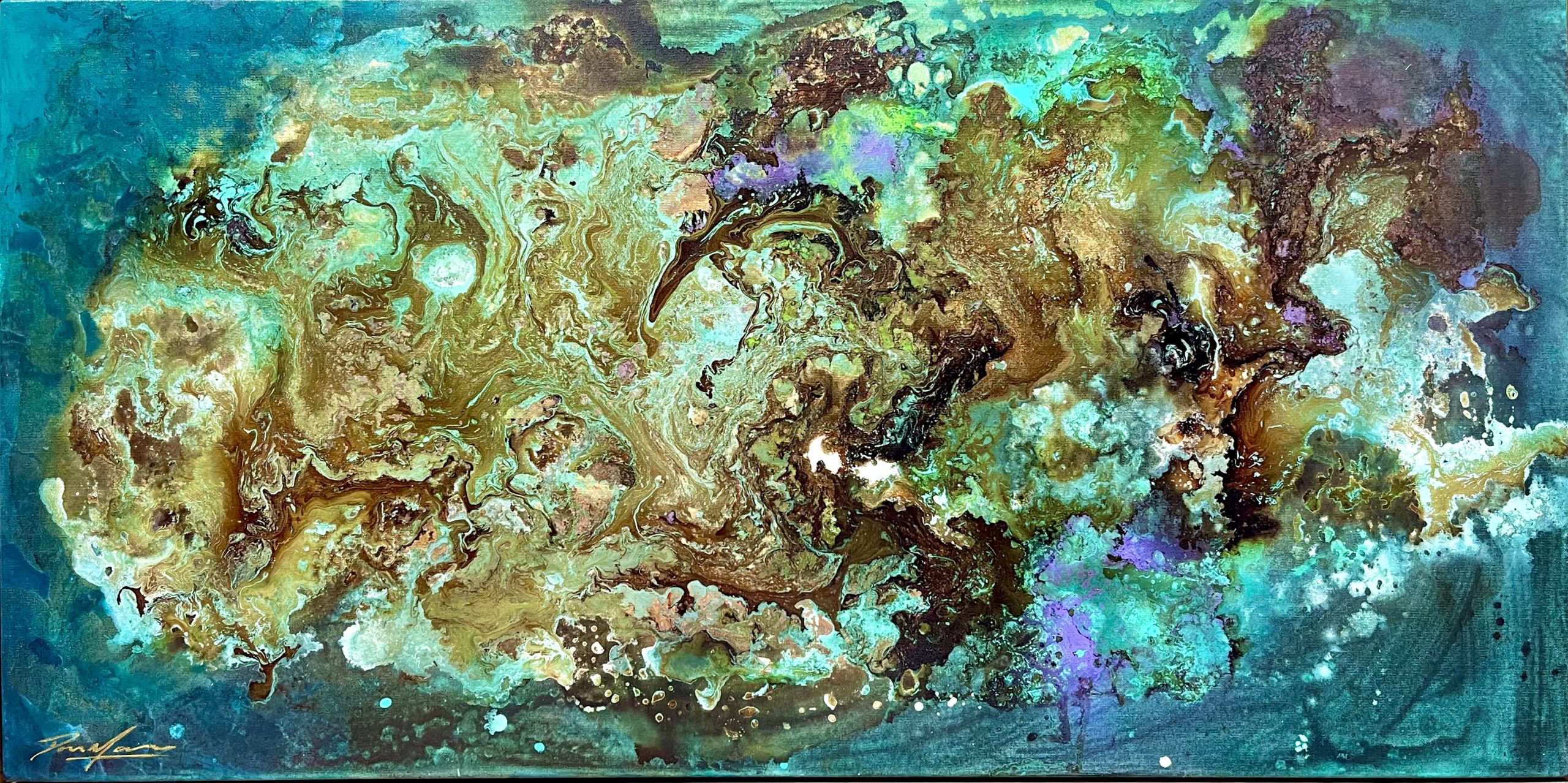 Talle Creek Swim No 2 by Dan Mason – mixed media on professionally stretched 22oz linen. 70CM X 140CM.
