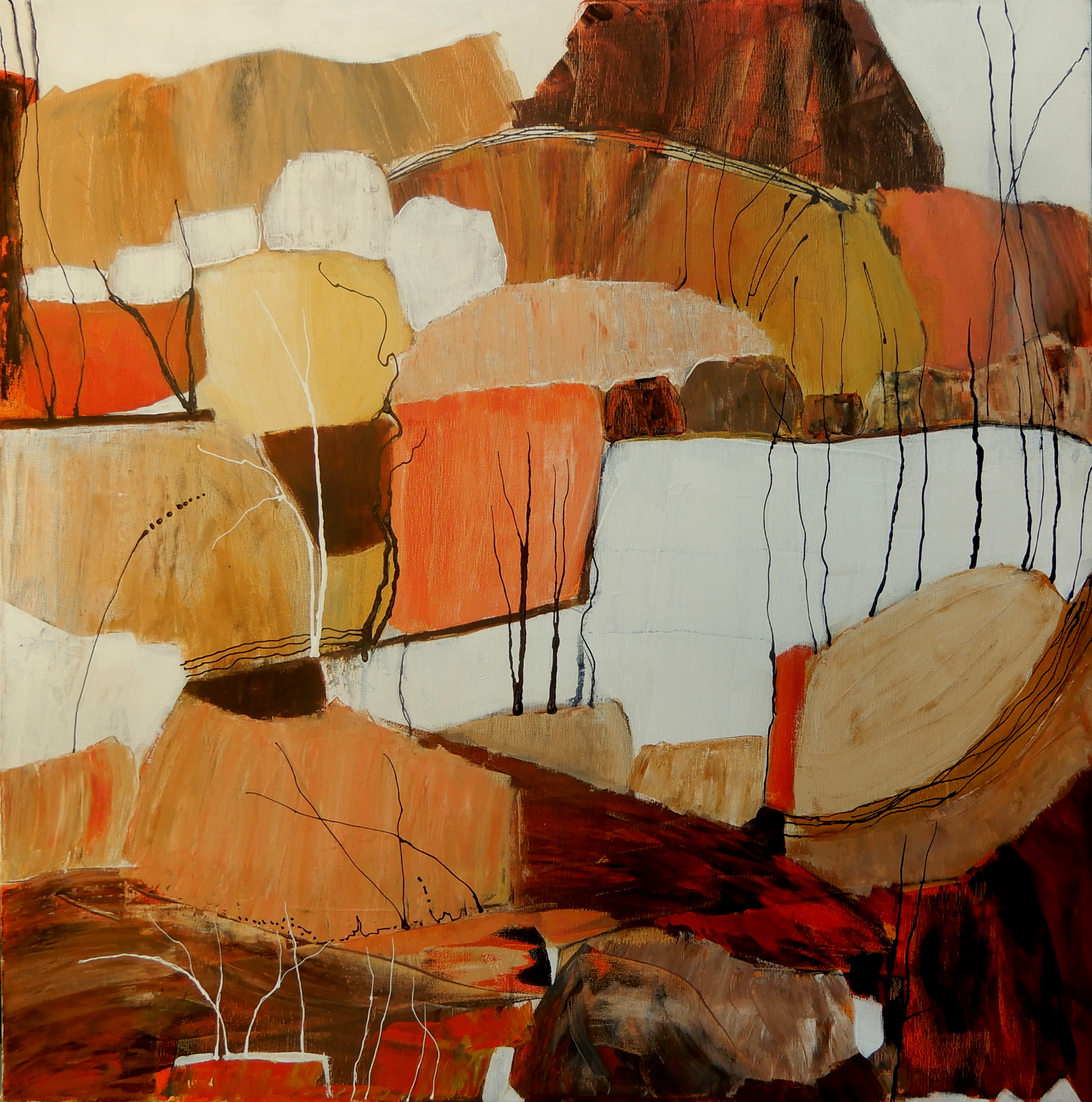 Tangerine by Dodie Herman – The colours and hues of the rugged Australian landscape exploring my version of the Zorn palette – Burnt Umber, Vermillion and Yellow Oxide with white. Usually used in portrait painting to achieve skin tones it makes for beautiful colours in a landscape. I mostly used an old credit card to move paint on the canvas to achieve variations in colours, tones and forms, using brushwork to create a more consistent surface without hiding the marks.