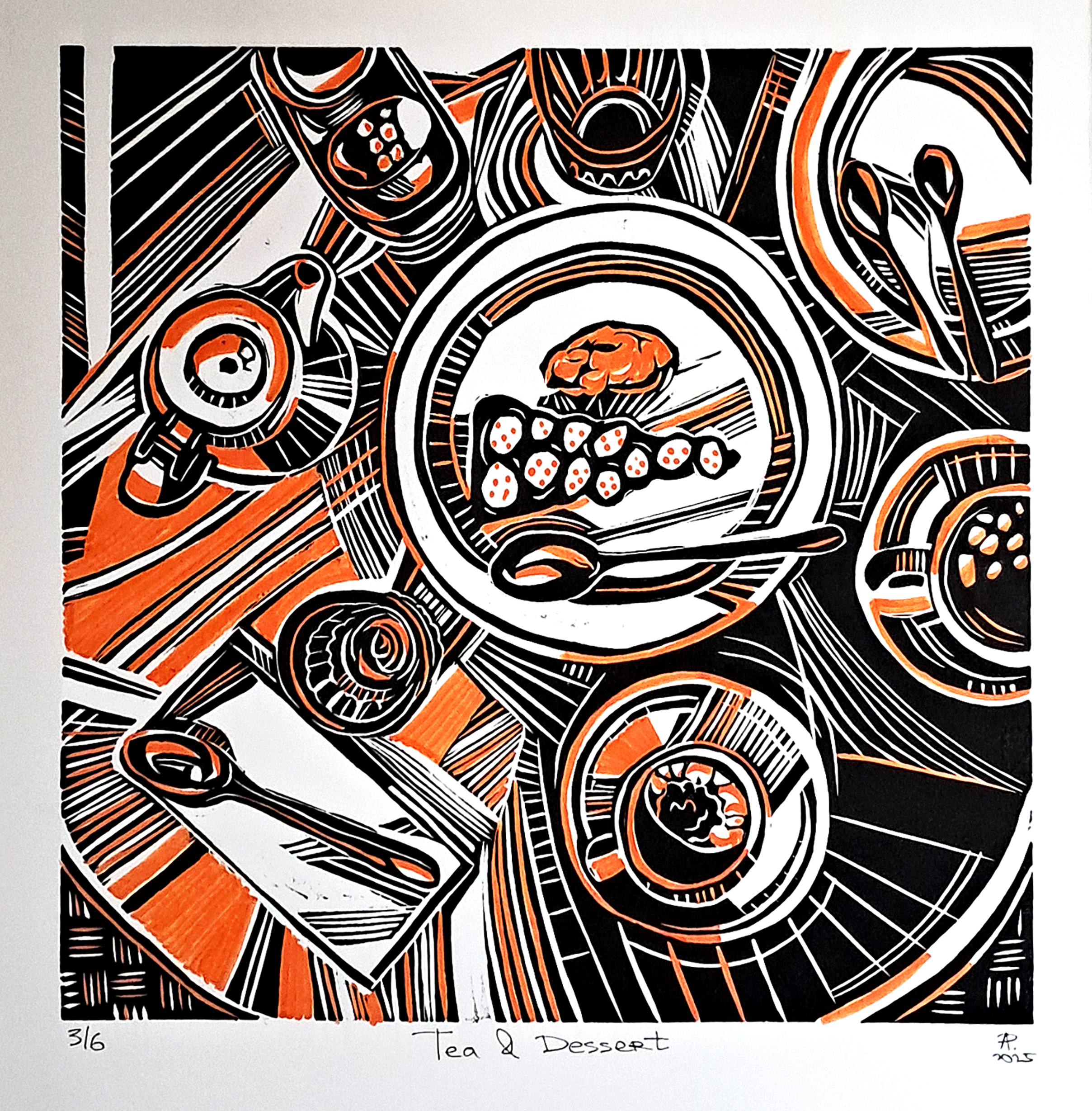 Bold colour. Graphic energy. A celebration of life’s sweetest pauses. This hand-carved linocut bursts with deep fiery orange, drawing your eye to the heart of the table — the joy of dessert and tea shared.