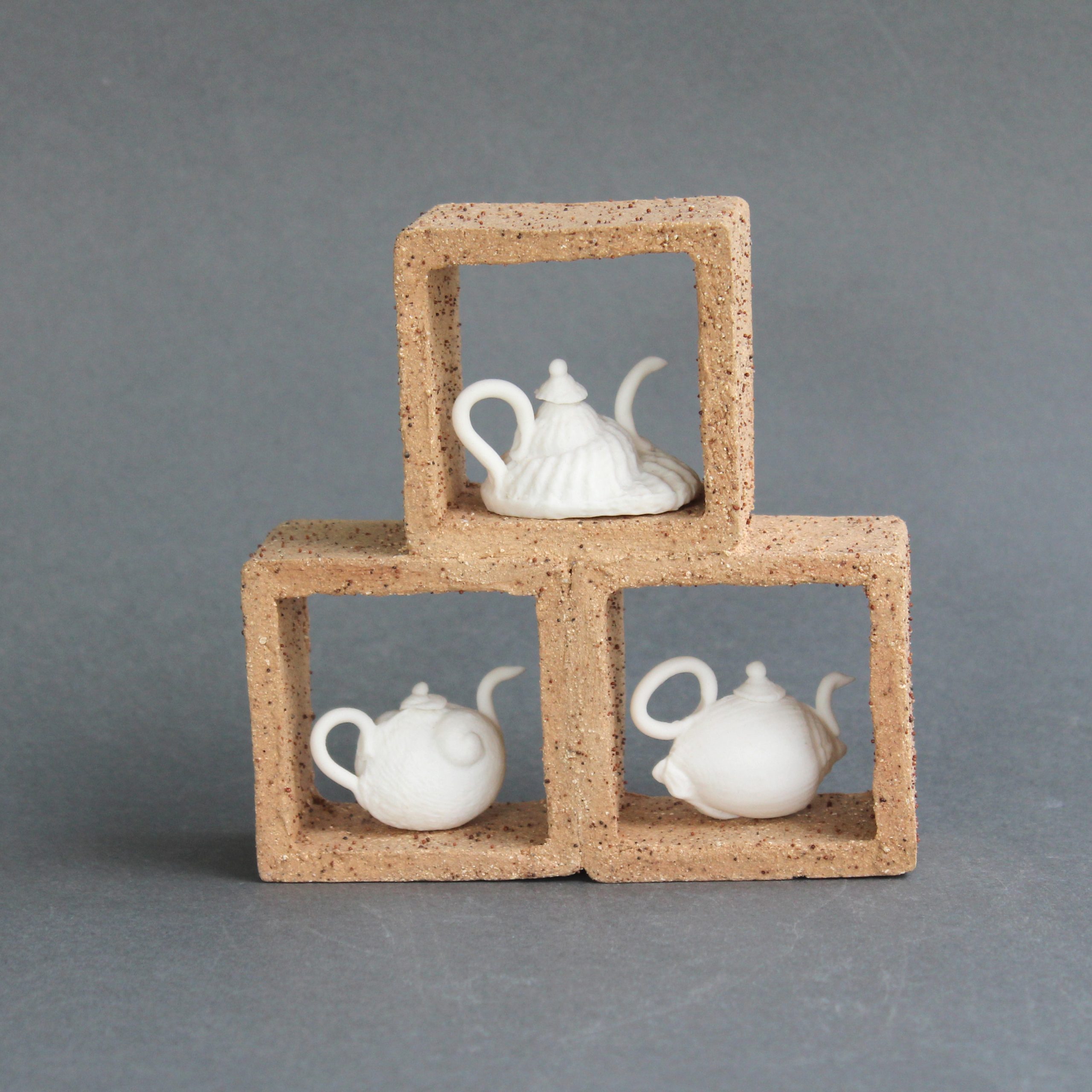 This whimsical set of shell teapots is an original small sculpture. My sense of humour often leads me to make non–functional and comical versions of teapots which play on the function, form, process and place.