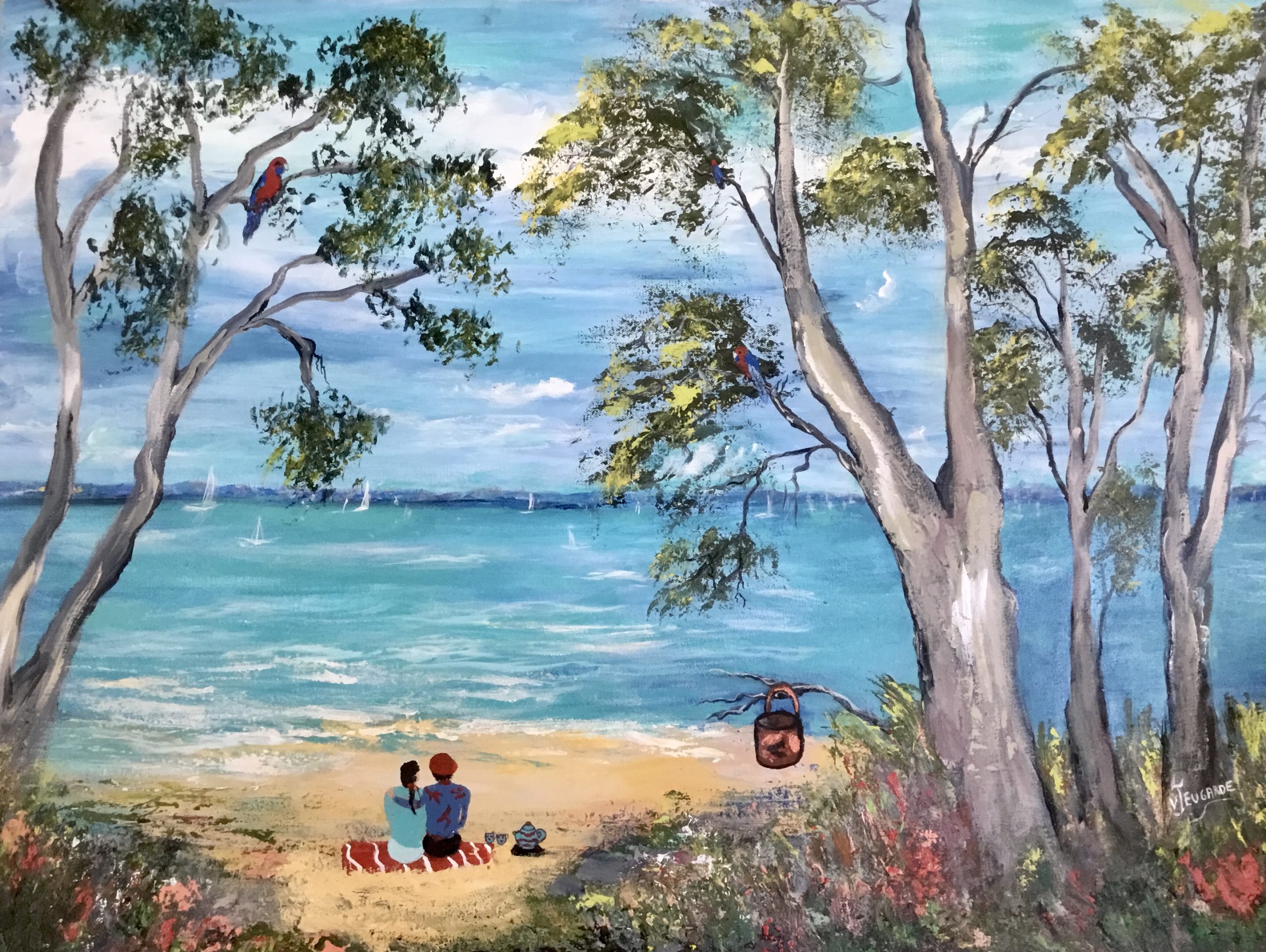 I live on a lovely small island and this spot is perfect for picnics, Tea for two and a romantic escape for couples, I have seen many boats or yachts anchor up and come in to take advantage of the lovely beach and amenities and just enjoy the peace and serenity for the day. This painting was inspired by the person who left a rusty old Billy hanging from the tree so I thank whoever that person was and I hope their day here was wonderful.