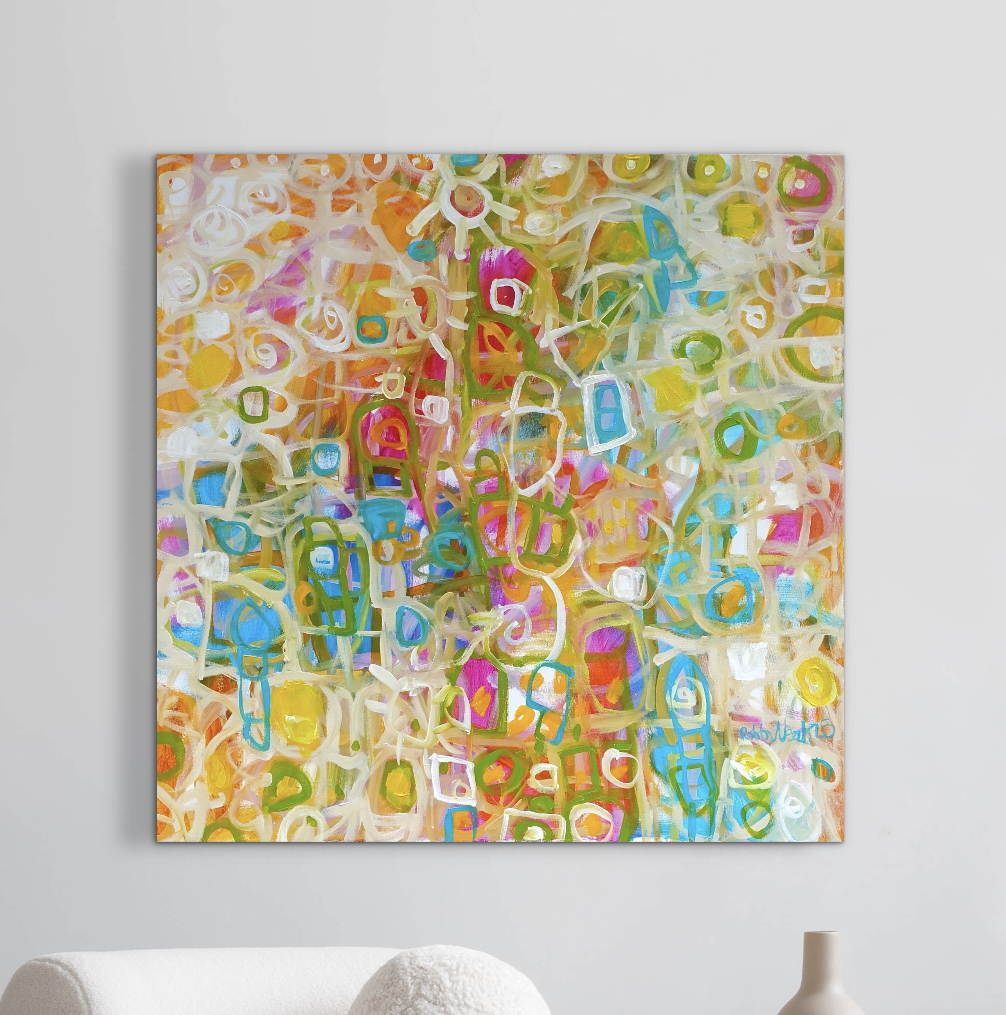This work is acrylic on 91 X 91 cm on Luca Premium Professional Canvas, stretched onto a kiln dried frame, wired ready to hang, signed on the front and sent with an artist cv and certificate of authenticity.