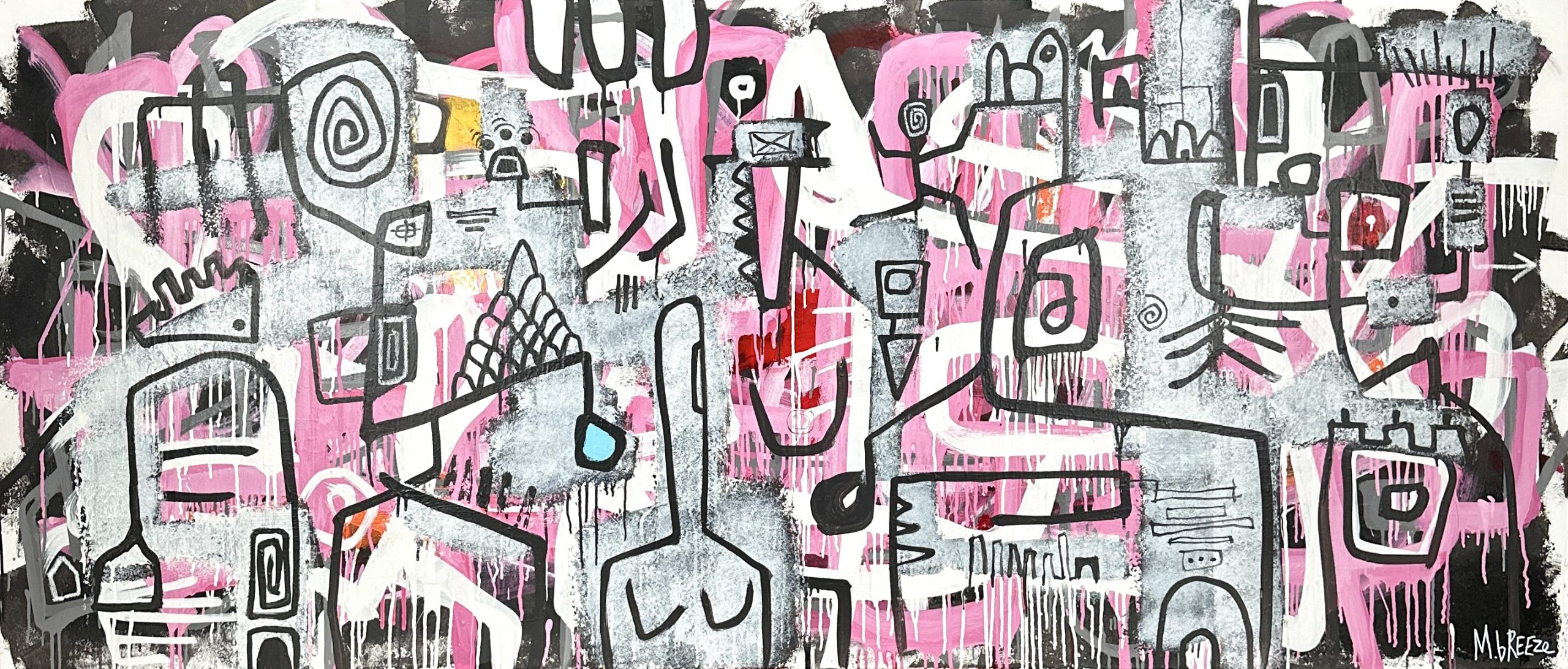 In this painting, I unleashed a tapestry of emotions using vibrant strokes of pink and assertive blacks against a textured grey backdrop. Each element and symbol dances chaotically, yet harmoniously, embodying life’s unpredictable rhythm. This piece, pulsating with energy and expression, invites viewers into a dialogue with their innermost feelings, challenging perceptions while energizing any space it inhabits.