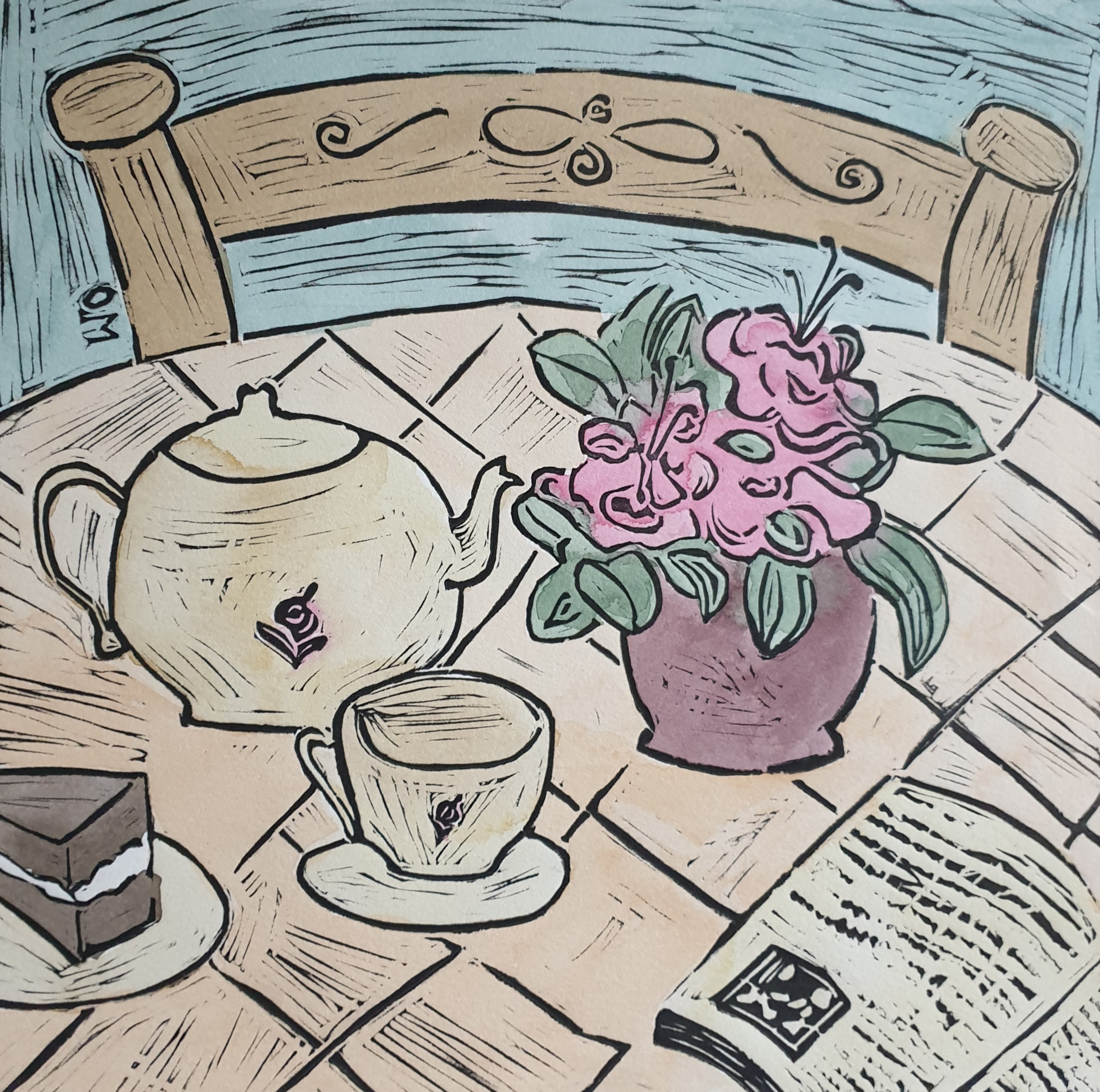 Teatime edition 1 by Olga Megele – Lino printing is a fantastic medium. It is very seductive to remove the layer of lino, not too shallow and not too deep! This sweet piece echos the joy of a quiet afternoon tea. A book to read, a slice of cake to enjoy and multiple cups of tea. Heaven! This print has been very popular. I can bespoke one for you! Please make contact to discuss your colour choices! Edition is limited to 50 prints.