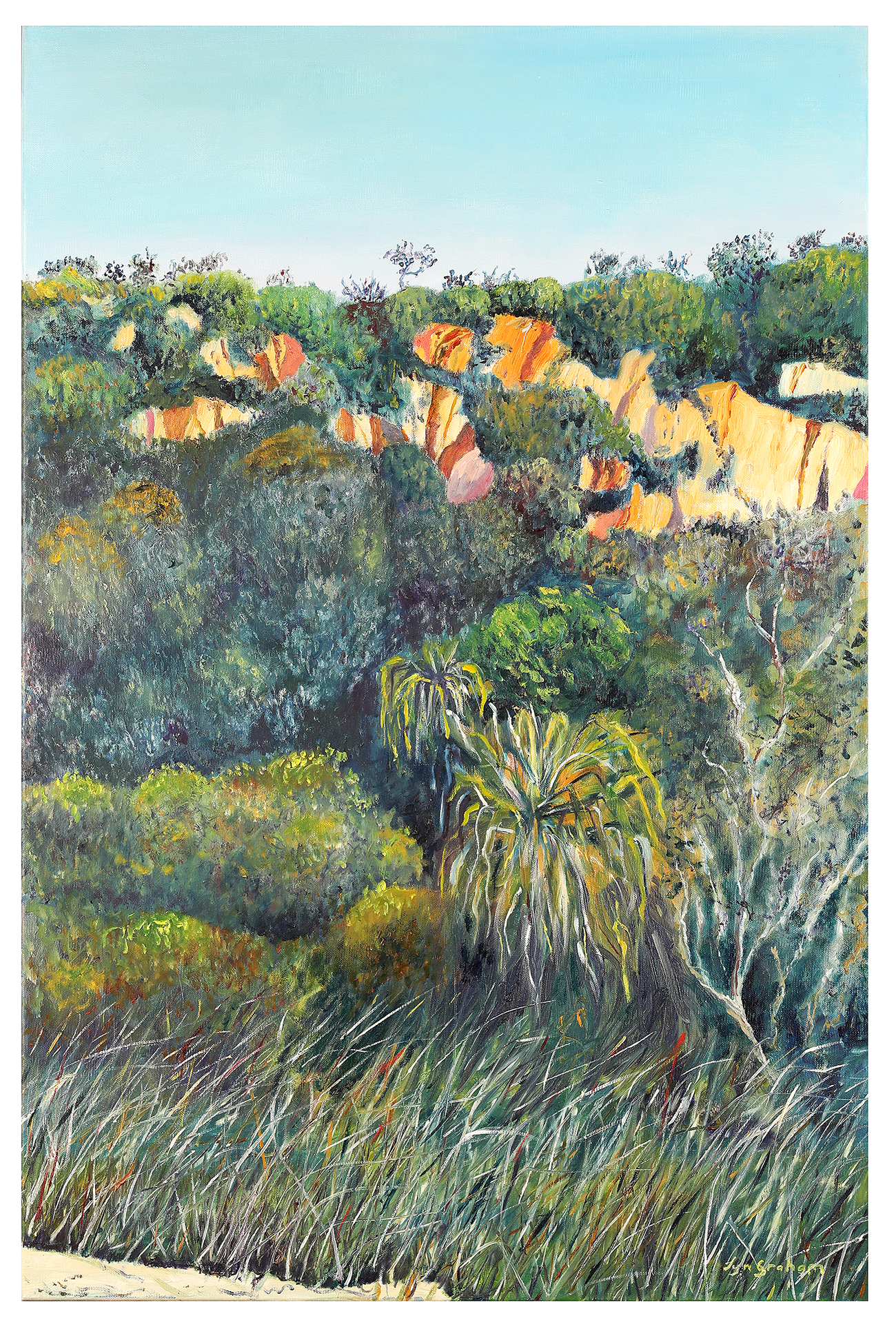 ‘Teewah Beach High Dune 2’ is one of 2 paintings in this series that depict scenes of the beach north of Noosa Heads. It’s part of Cooloola National Park, which is very similar country to the internationally famous and World Heritage-listed Fraser Island just to the north. I regularly travel along this beach on my way to Double Island Point, where I have been a volunteer doing weeding and revegetation work for the last 20 years.