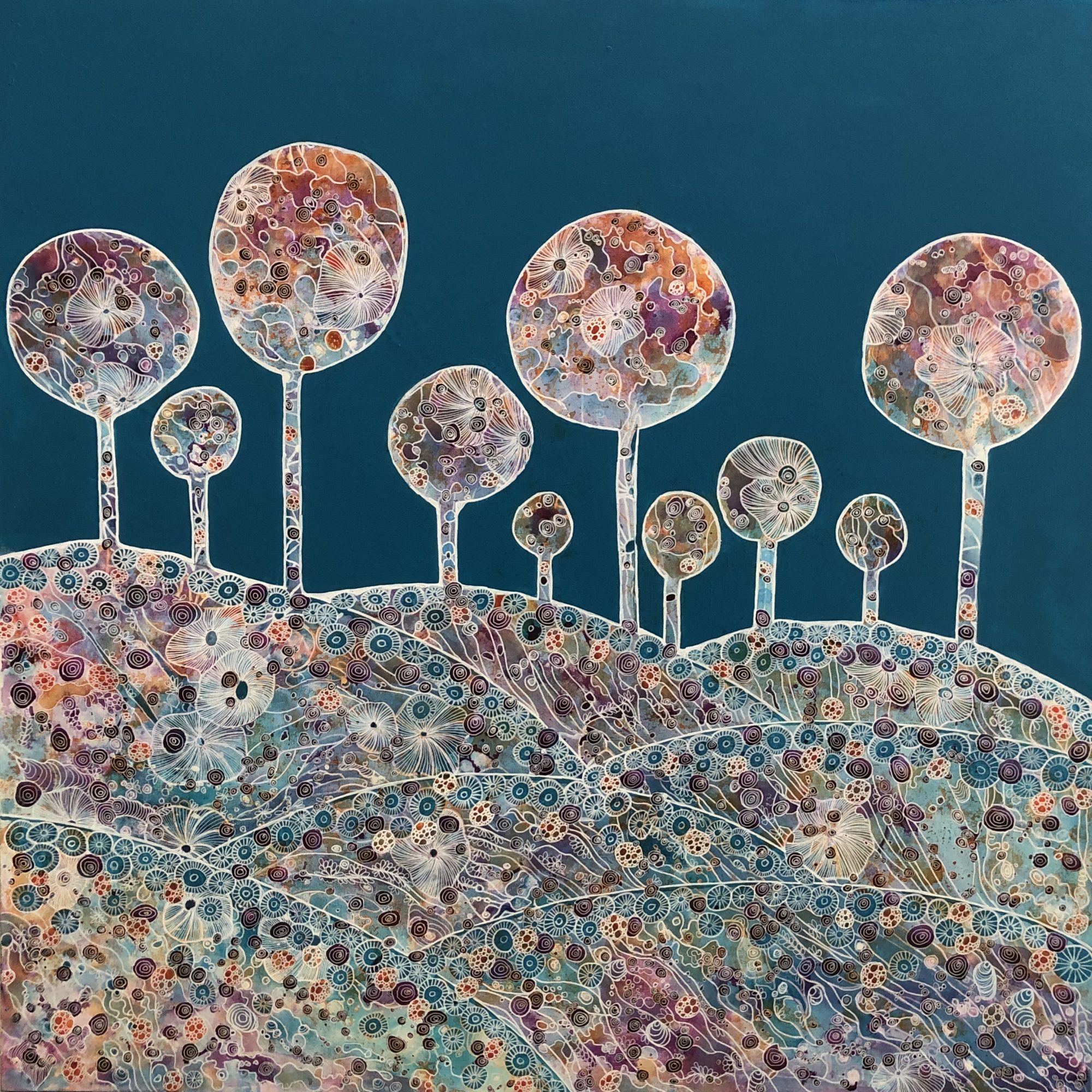 Original hand painted abstract art. Lots of patterns within the trees and hill, Â surrounded by the bold turquoise. One on top of the other, each with their own line detail and pattern. Acrylic paint applied using a brush for the base and then hand drawn lines using an acrylic pen added. Each brush stroke is used as the shape to draw the lines. Lots of lines. Lots of detail. Look at the close up photos and you will see the detailed line work, sometimes the photos do not do the painting justice. Love this painting, love the effect.