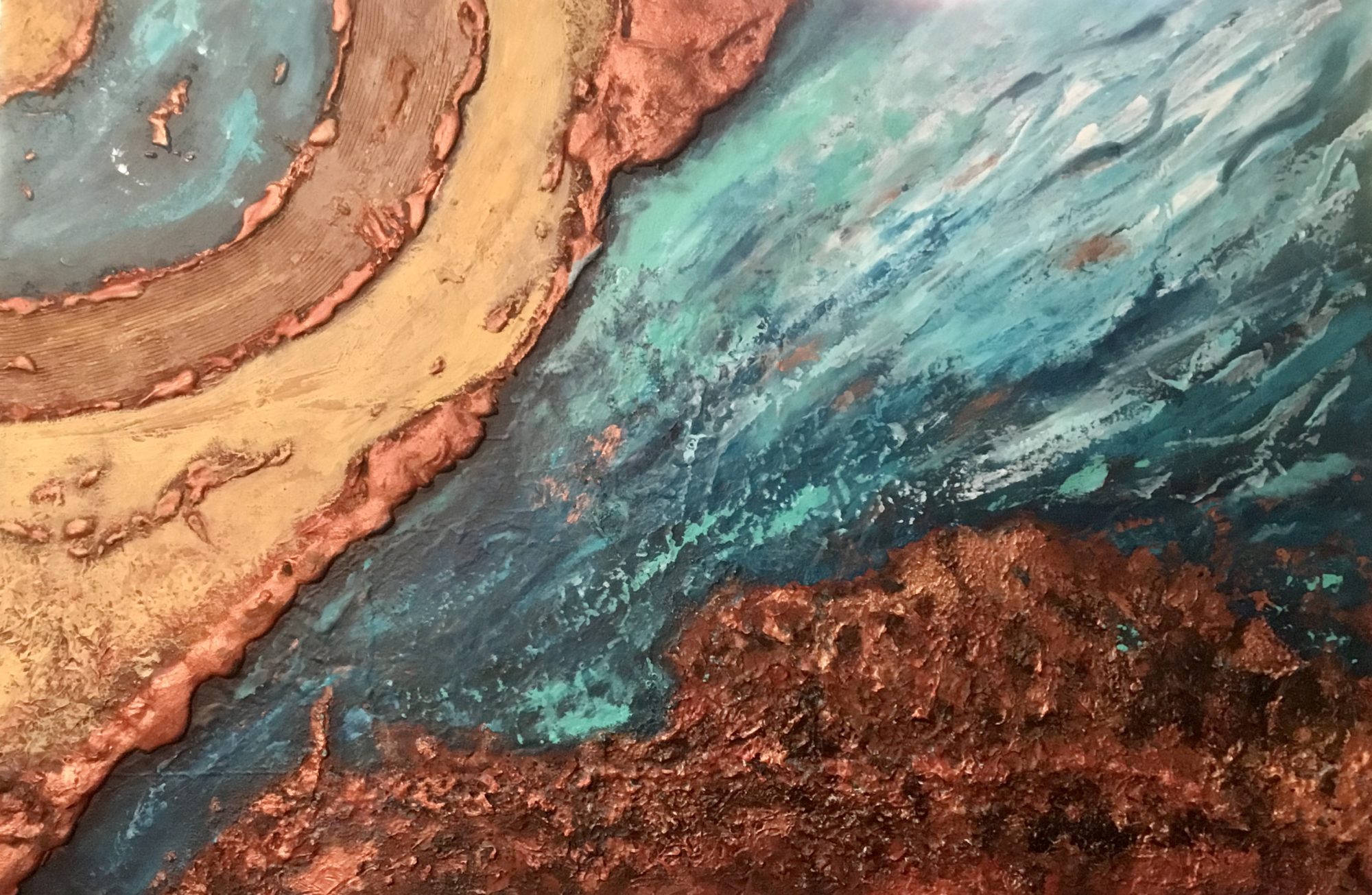 Tequila Bay is a seascape of turquoise waters and rocks that glow copper in the sunshine, it is reminiscent of my years spent on North Stradbroke island where I loved to walk around the gorge, of course it isn’t a true representation but my way of combining the mainland and the bay and my imagination.