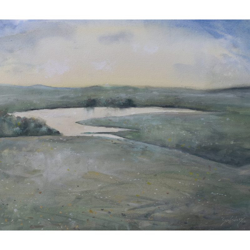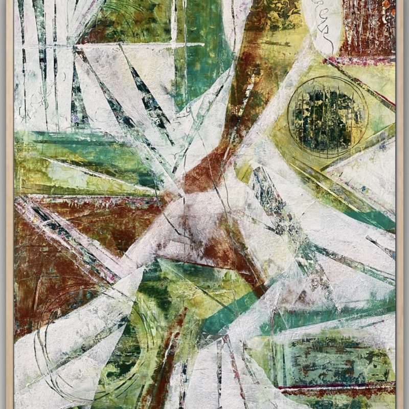 Tequila Sunrise by David Clare – The inspiration for this series, and this painting is from years of working with digital images in my graphic art working life. I have combined both my digital creativity with painting creativity to come up with these random, yet controlled paintings. This painting suggests an early morning sunrise through a rugged landscape, and perhaps blurry eyes.