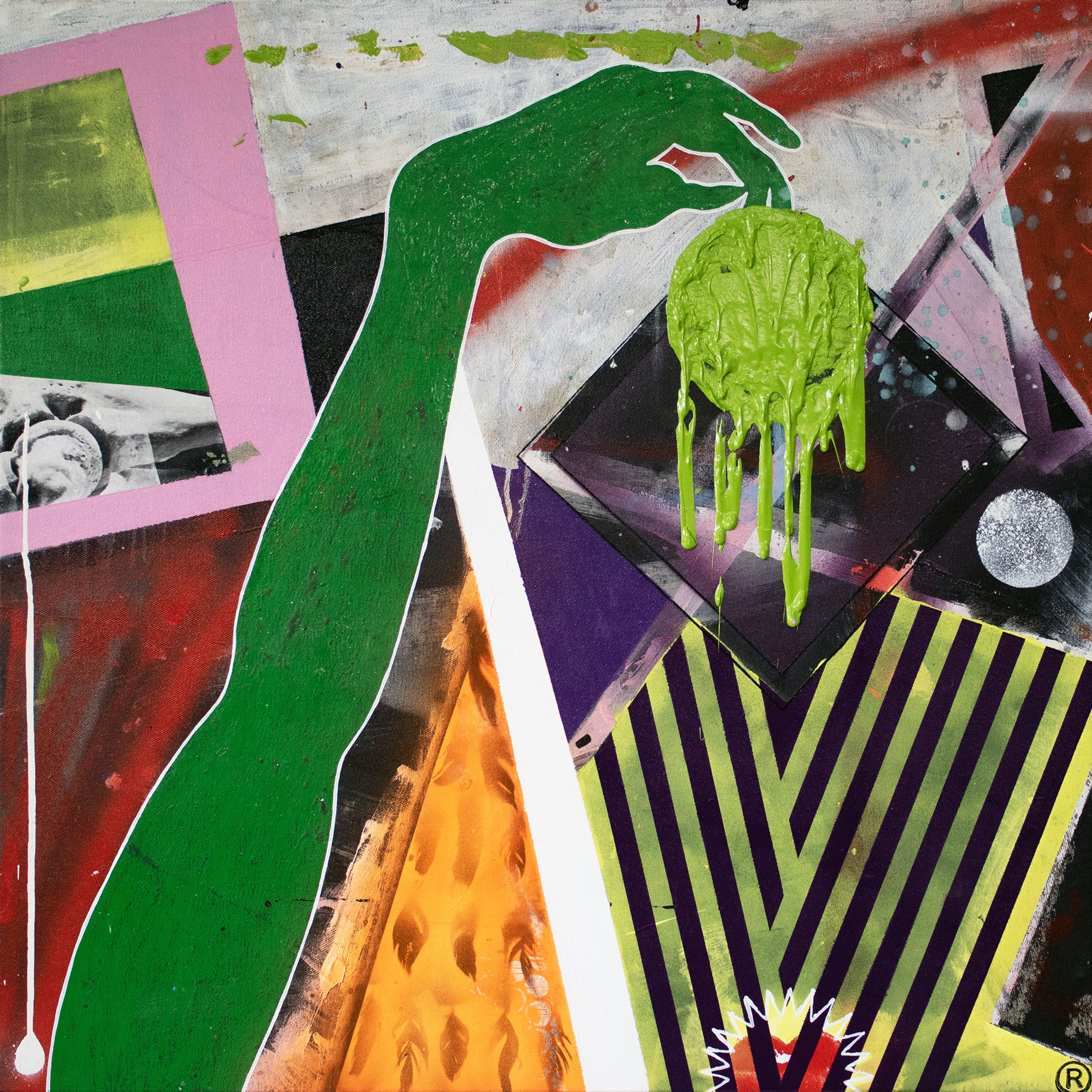 Tessellate by Rehgan De Mather Mixed media – acrylic, spray paint, oil stick, copic marker, charcoal and collage on canvas.
