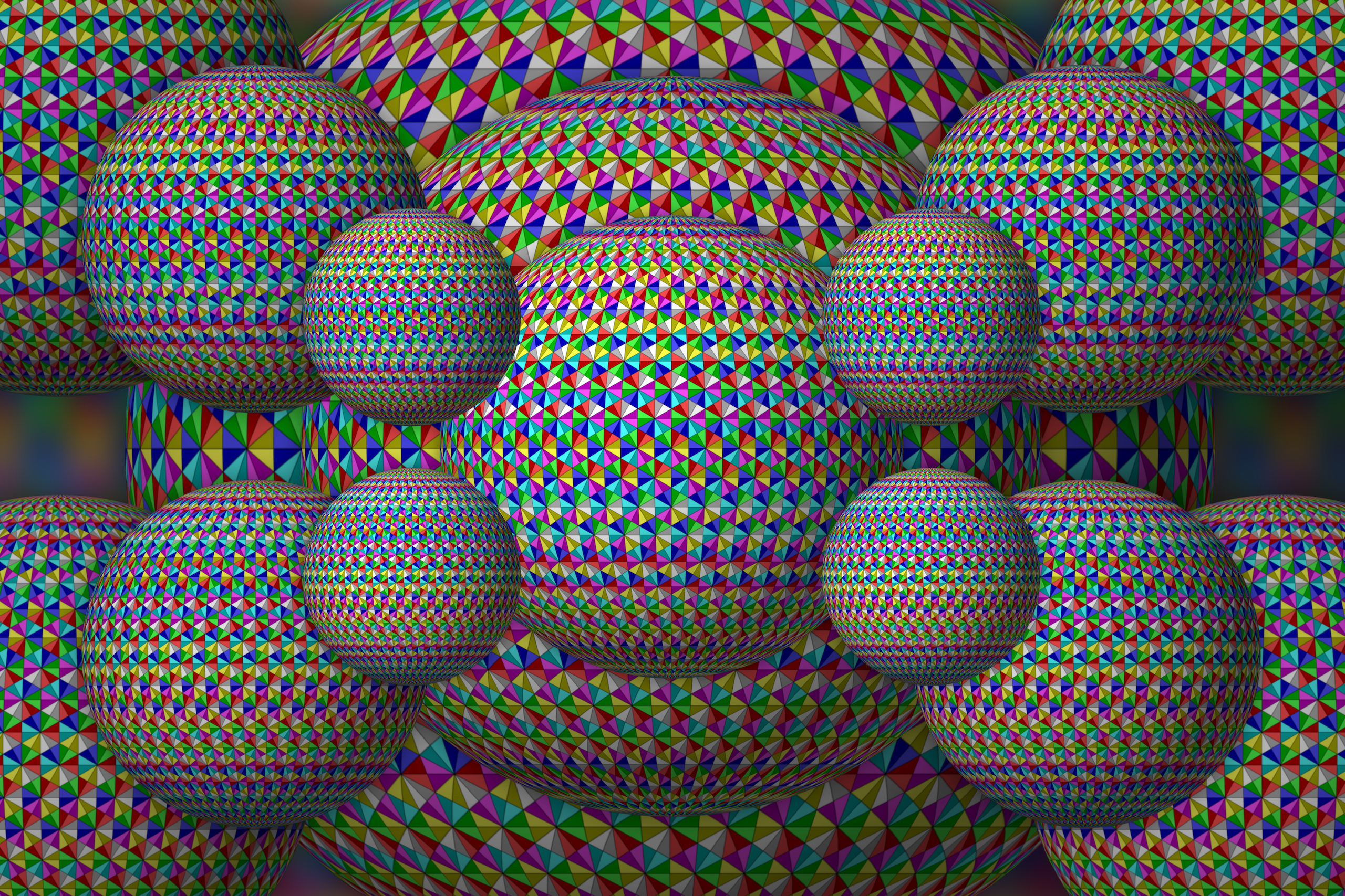 At high 7680×6480 resolution, this is Maths Art of the highest quality. The background sphere layers are actually progressively slightly darker, lending the image more depth. This piece is a celebration of mathematical and geometrical precision, and the joy of patterns and colour.