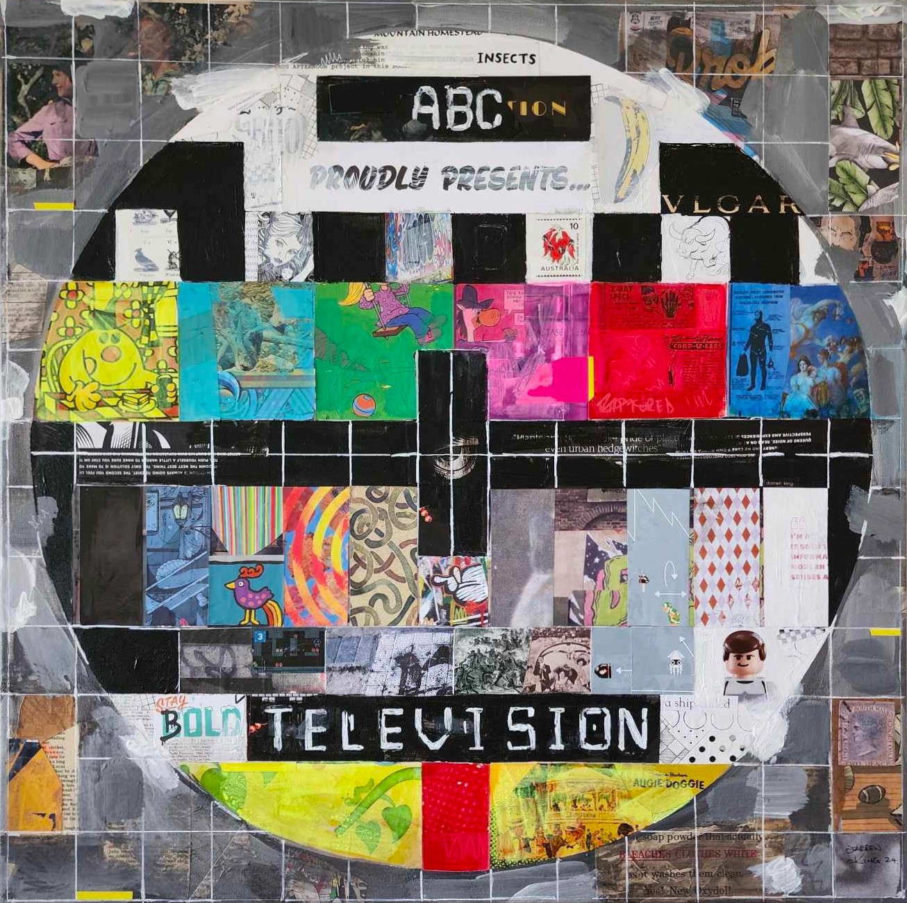 Acrylic gouache and recycled paper collage on stretched canvas
