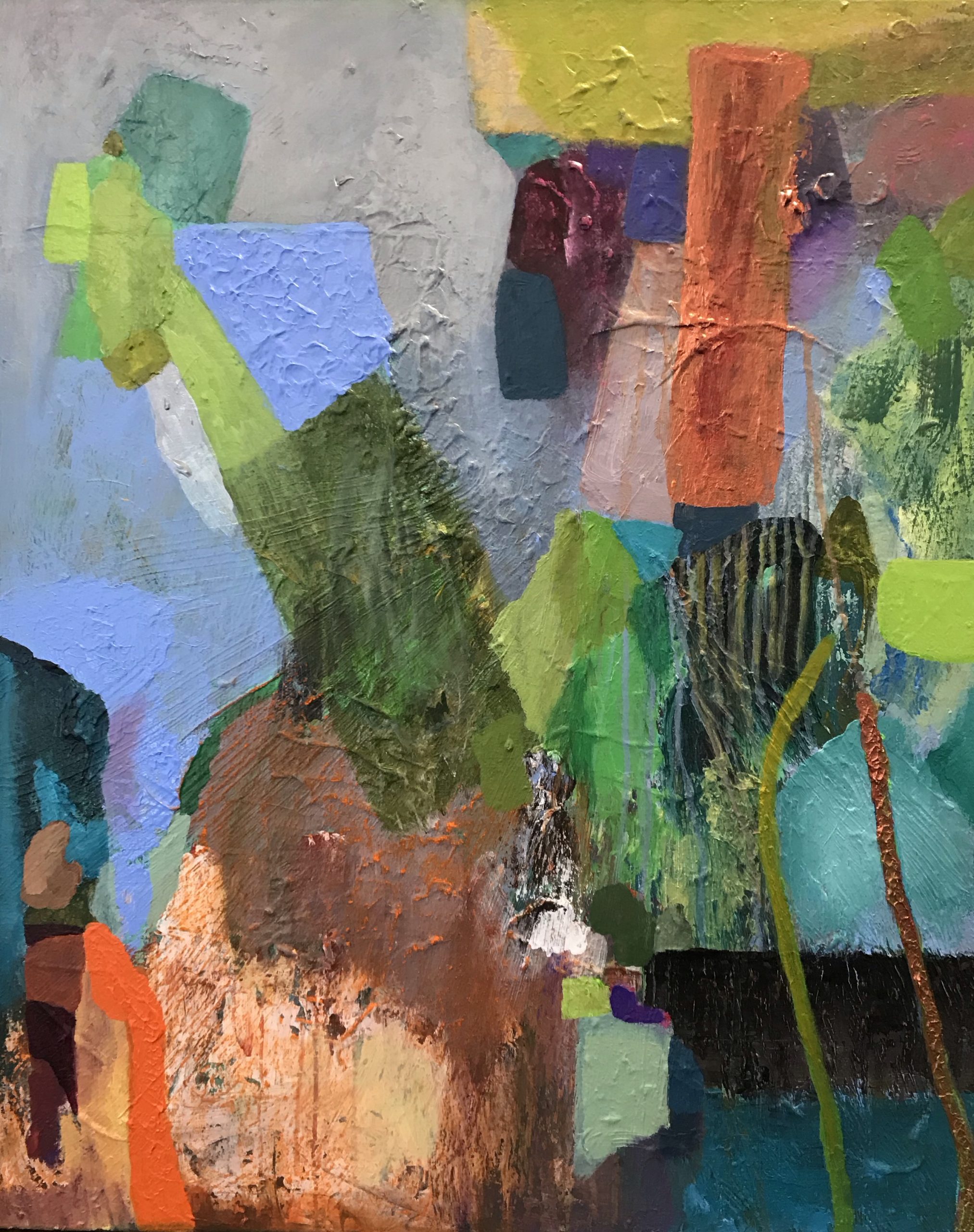 This is the last in this series showing my journey into the power of abstraction with a sense of presence asking the viewer to engage and connect with my joyous vision. My compositional placement of shapes and colours using opaque and transparent pigments allows some of the various layers to show what lies beneath and working with textural media increases the tactile nature of the painting.