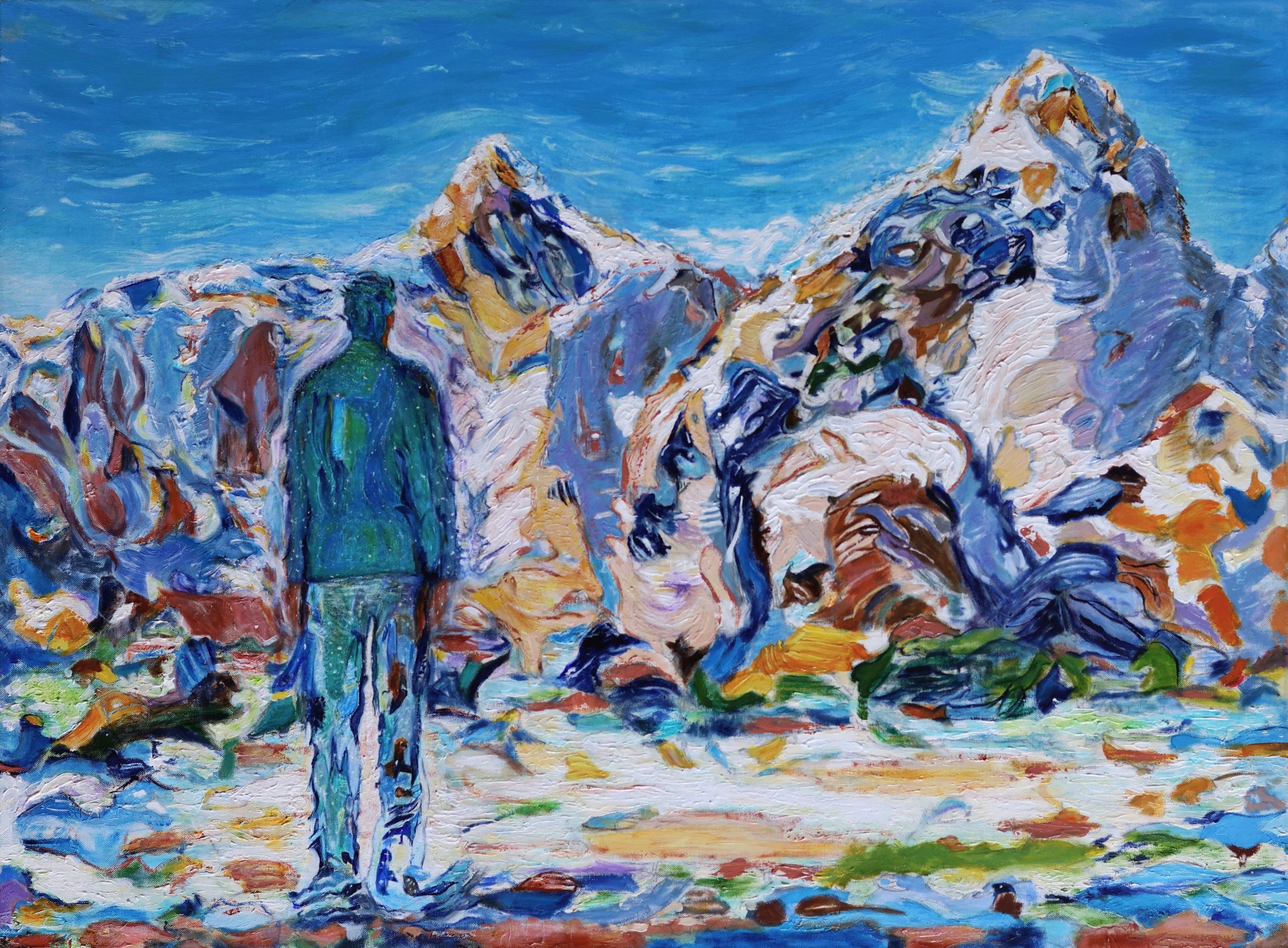 Dreamtime is a striking painting captures a quiet, powerful moment—one person standing still before a vast mountain landscape. The expressive brushstrokes and rich layers of blue, white, and warm earth tones give the scene energy and movement, while still maintaining a calm, reflective mood.