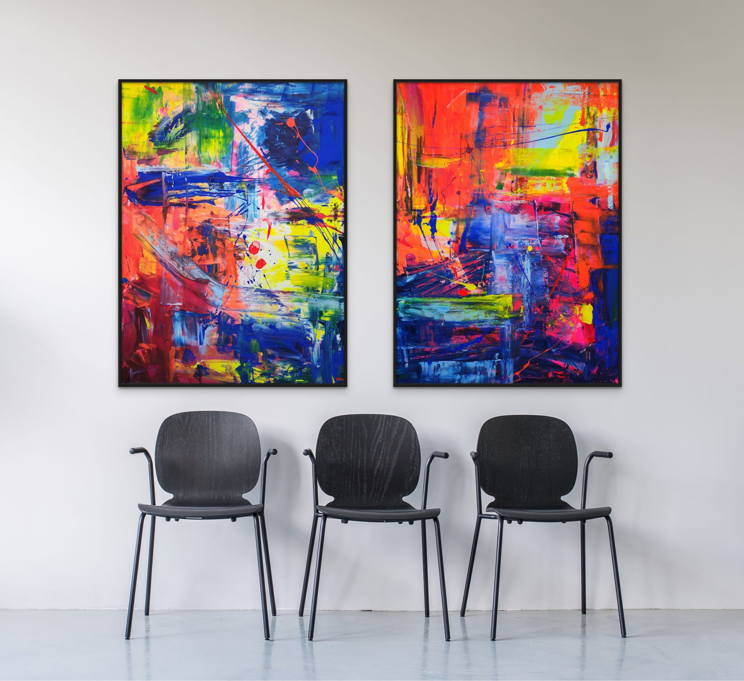 This colourful modern artwork is comprised of two 122cm x 90cm canvases. It is made with lots of layers of texture and drips of fluorescent acrylic paint. It was sprayed with varnish for a protection of colour. Singed with certificate of authenticity.
