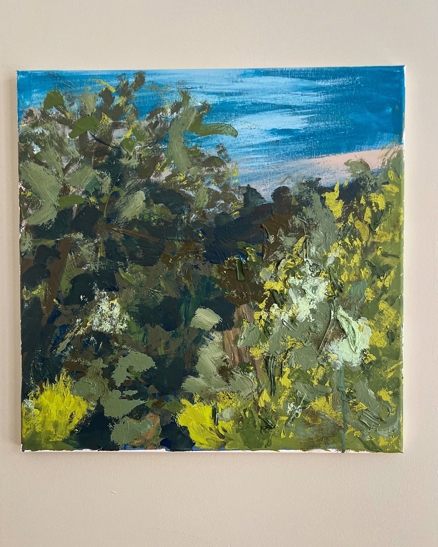 Thank You by Sabina Puzey – is an acrylic painting inspired by my daily walk I do with my dog. For many years I was unable to walk or leave the house, and one of the things I missed most was being able to walk my dog, get down to the river, and feel the wind in my hair and on my face. In my healing journey I have been learning to shift my focus off the goal and instead measure yourself based on the GAIN, i.e.. how far you have come from where you were last week, last month, last year.