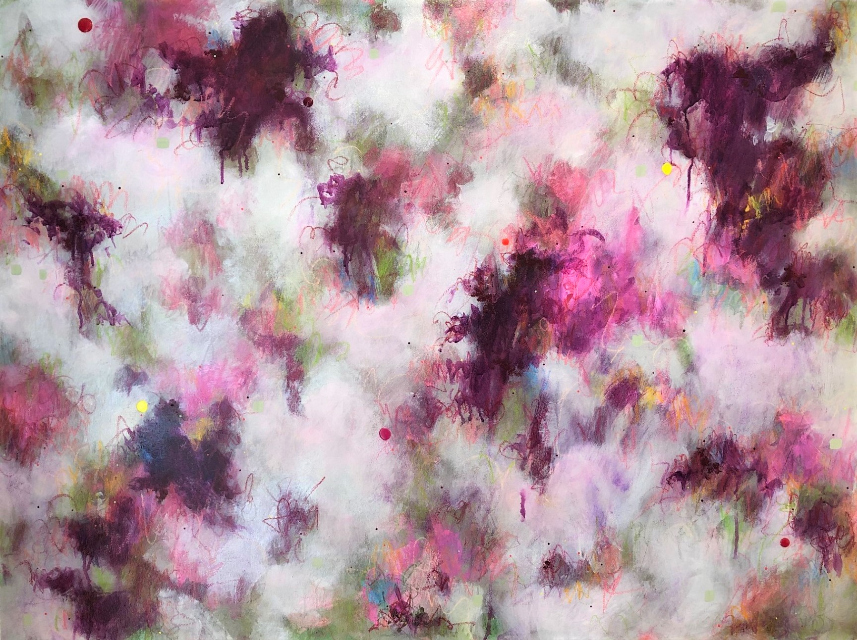 “That Moment in Time” is a poetic exploration of impermanence, memory, and the ethereal beauty of nature. This abstract floral composition is layered with soft washes of white and pale pastels, creating a dreamlike atmosphere where vibrant bursts of magenta, deep plum, and fresh greens emerge and dissolve like petals caught in a gentle breeze.