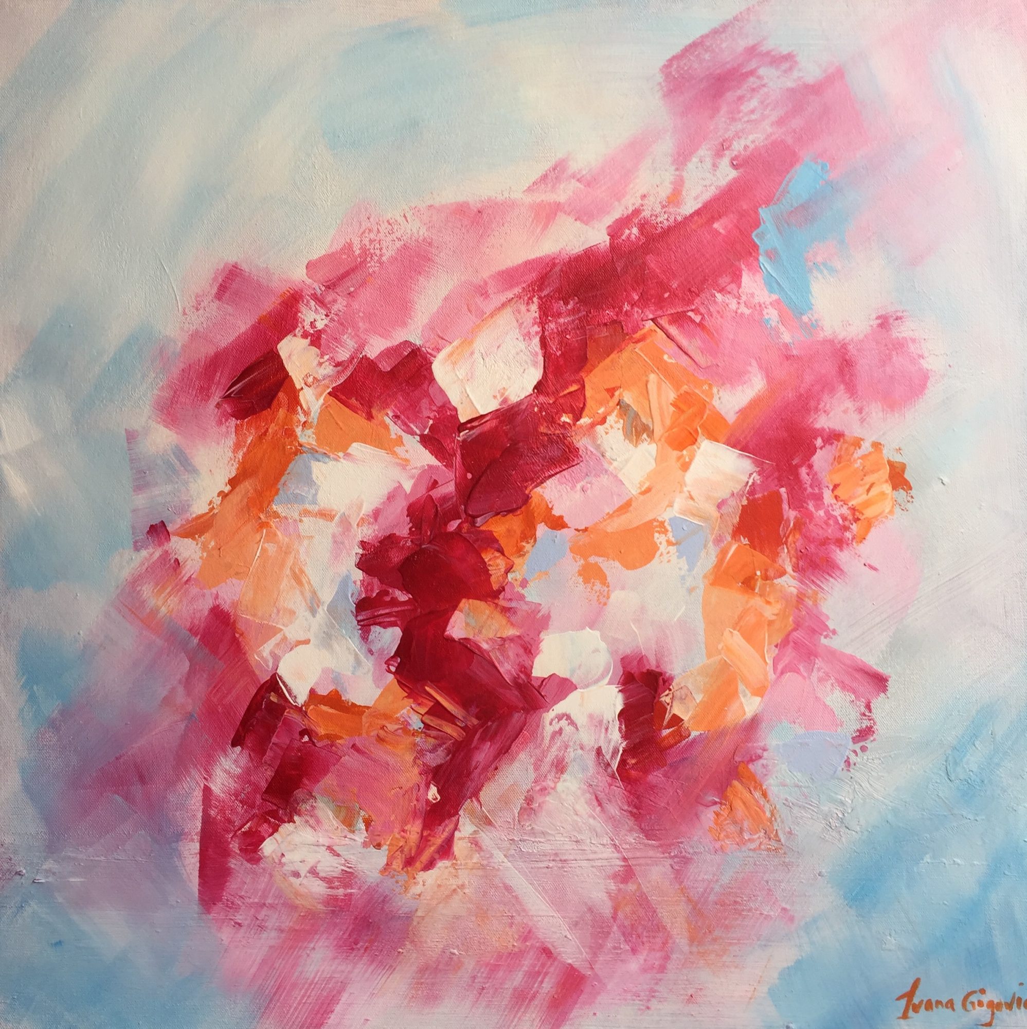 Summer’s here and there’s nothing better than seeing a bright blue sky and vibrant surroundings to put a smile on our face and a feeling of joy. I loved creating this painting, using these pink and orange tones and the texture throughout. It resonates beautifully with this time of the year.