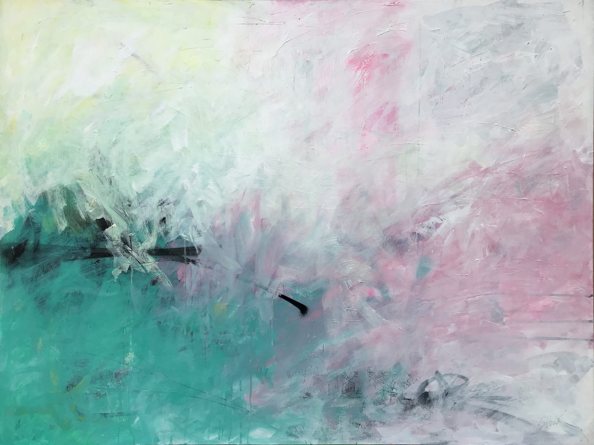 I really enjoyed the creative process of producing this light, bright and airy abstract painting. The pale yellow, pink and aqua are mixed with sprays of black aerosol which are revealed in some areas. The texture and gestural marks create a beautiful flowing movement and rhythm. I think you can feel the energy and emotion I poured into this work. The text can be seen in parts and overall you can gaze upon this piece every day and discover something new. As the title suggests, that’s the way I like it in life and I hope you do too!