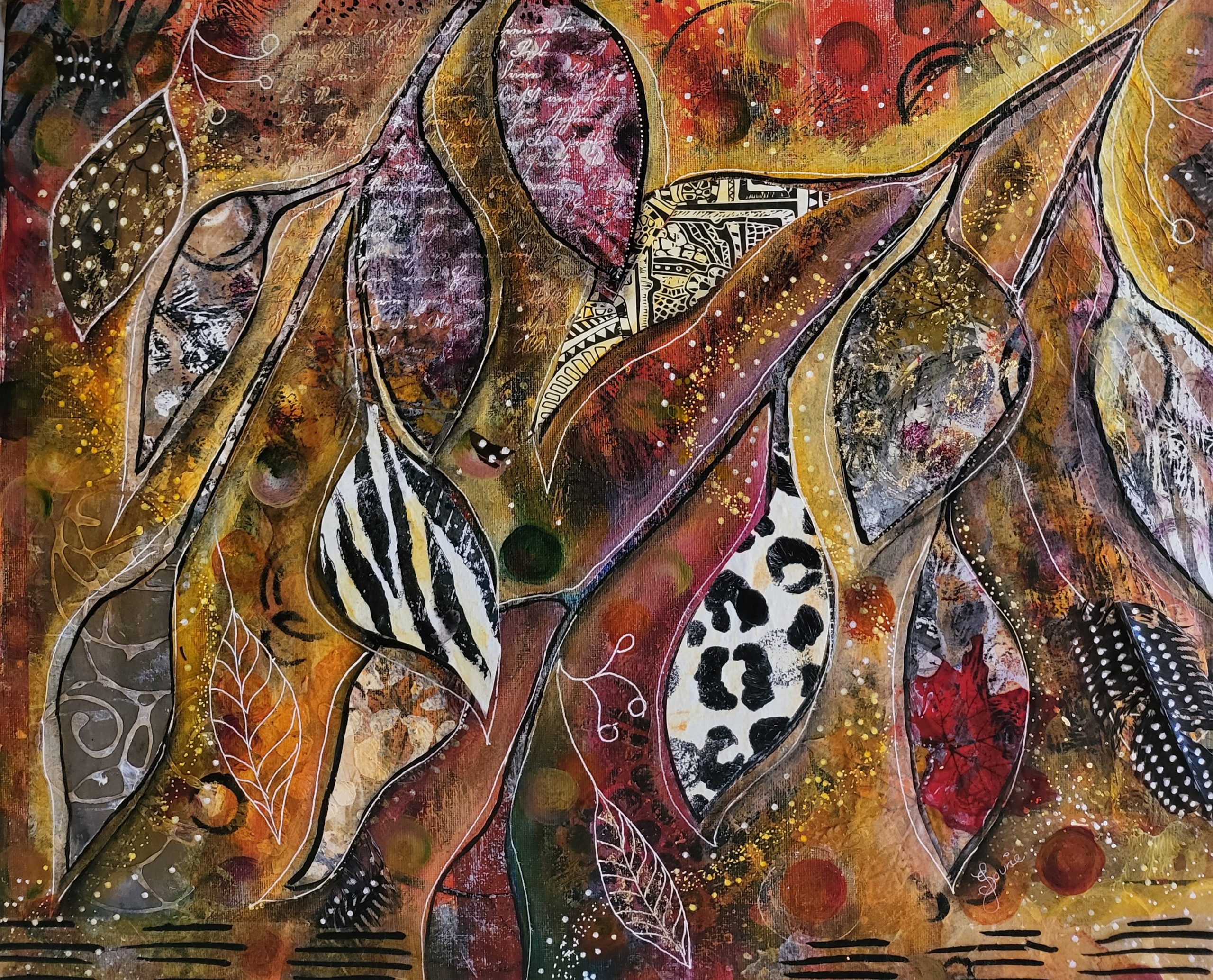 By blending collage, warm colours and textures, this artwork comes to life with intricate details to captivate the viewer’s eye.