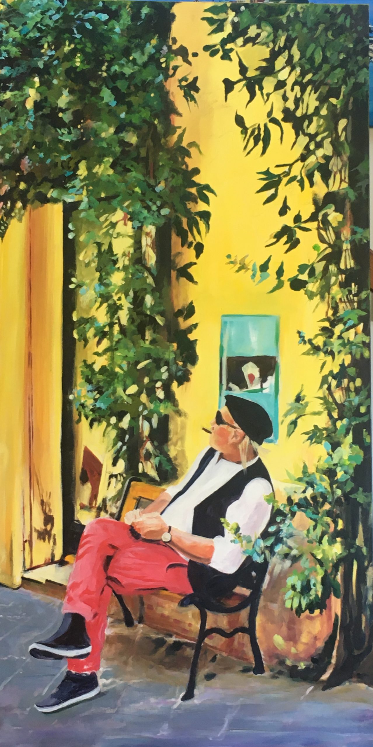 A trip to Rome inspired this painting. As we walked along Via Margutta I was drawn to an eccentric character sitting outside his studio gallery. He sat smoking a cigar and acting as if he owned the world. His brightly coloured clothes were enhanced by the backdrop of a bright yellow wall and clinging green vine. He didn’t smile or engage with us in any way – he was far too important for that! The colour and the drama of it all seemed far too important to be ignored and sang out to be painted. The statement sized canvas hangs in a portrait orientation to showcase the subject which is essentially the artist.