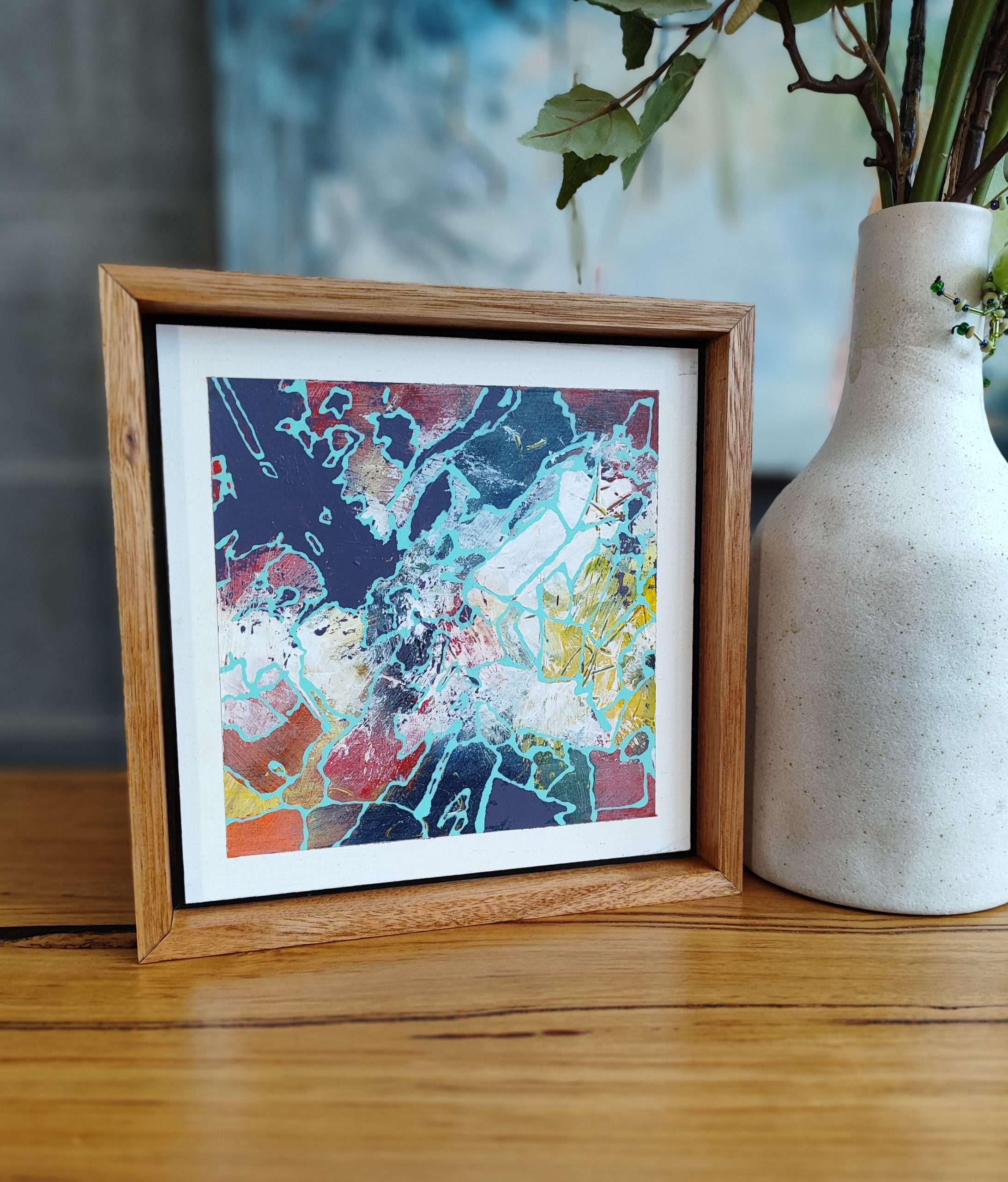 The Bay by Steve Tyack – The shape of coastline and waterways as they meet the land along the shoreline so typical here in many parts of Australia. The interaction we have with those places is fundamental to our ongoing survival. Signed on the back.