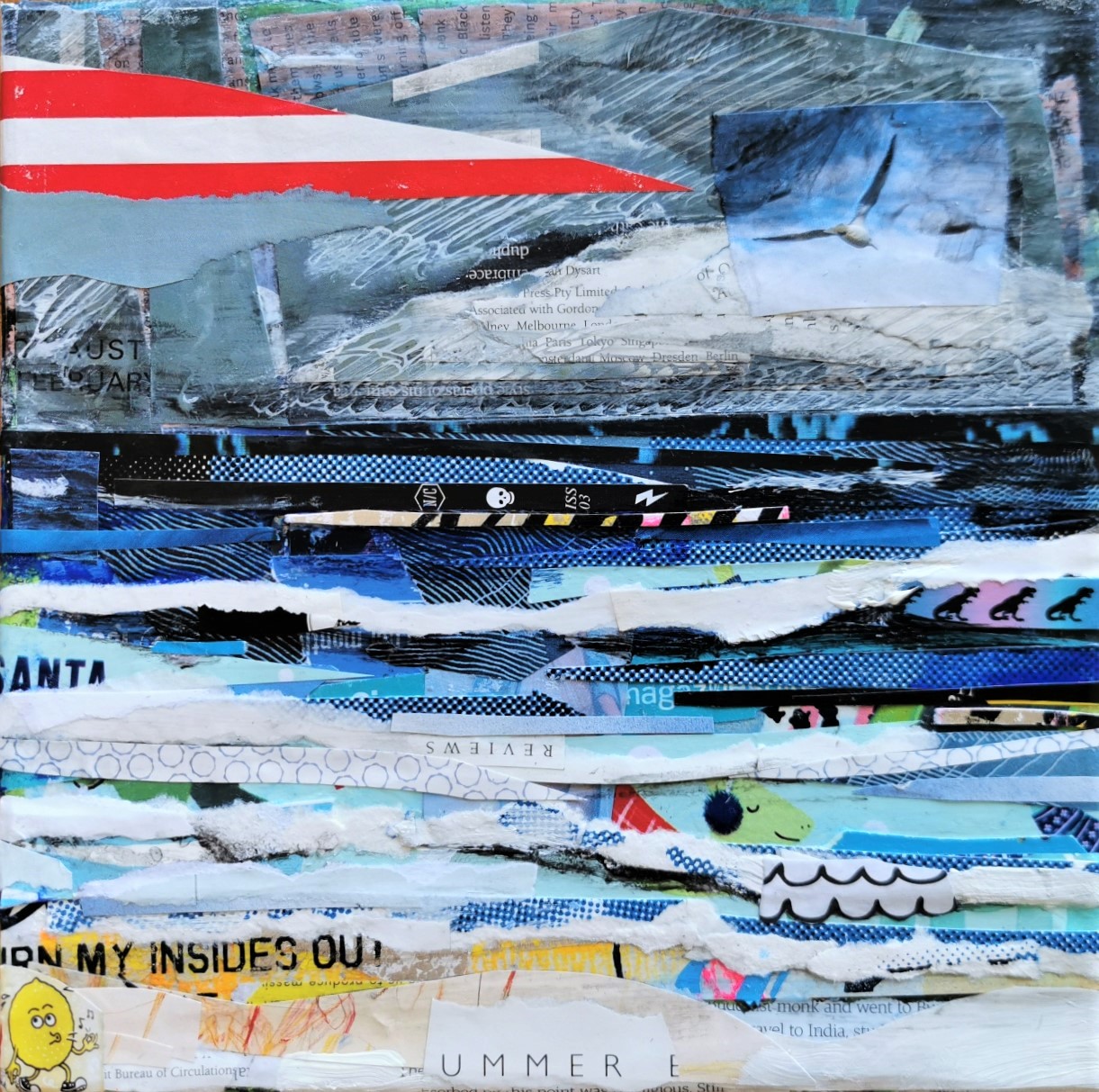 This piece was created using paint and collage. The artwork is based on a photo I took last year at a beach in the Illawarra called Perkins Beach. This artwork combines recycled magazine clippings torn, cut and assembled along with recycled pieces from my screen print work, to create a textured, heavily layered small one of a kind piece. Also on this piece are a few small print highlights containing a shiny metallic silver foil, which pops when looking at the work on an angle. Difficult to photograph but it’s more visible on the side pic as the light strikes it.