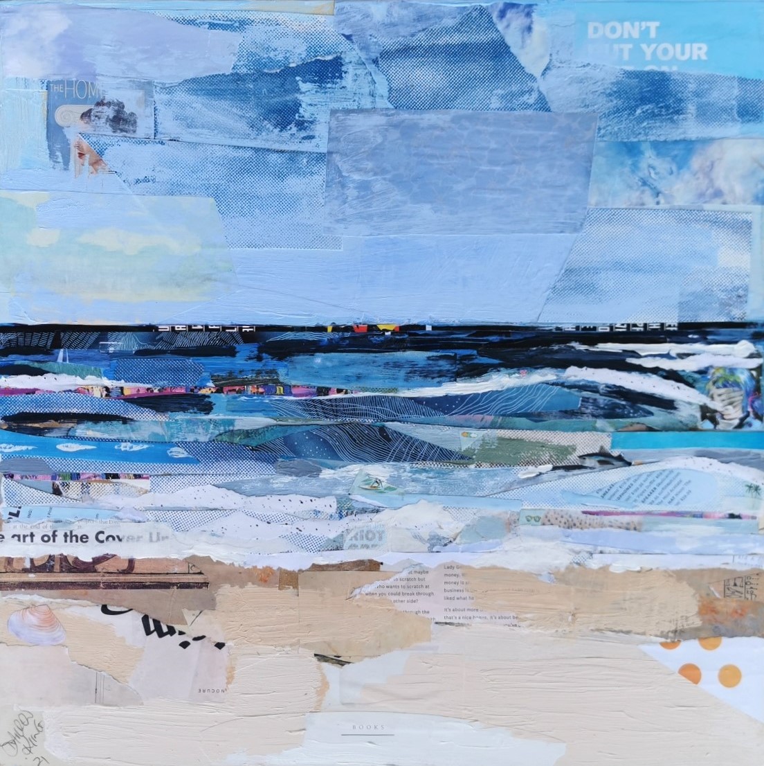 ‘The Beach’ is a seascape/landscape artwork based on a photo I took at Perkins Beach in the Illawarra earlier this year. This particular artwork contains a whole bunch of abstract collaged elements that combine to bring the whole piece together. Loads of detail, loads of layers within the piece.