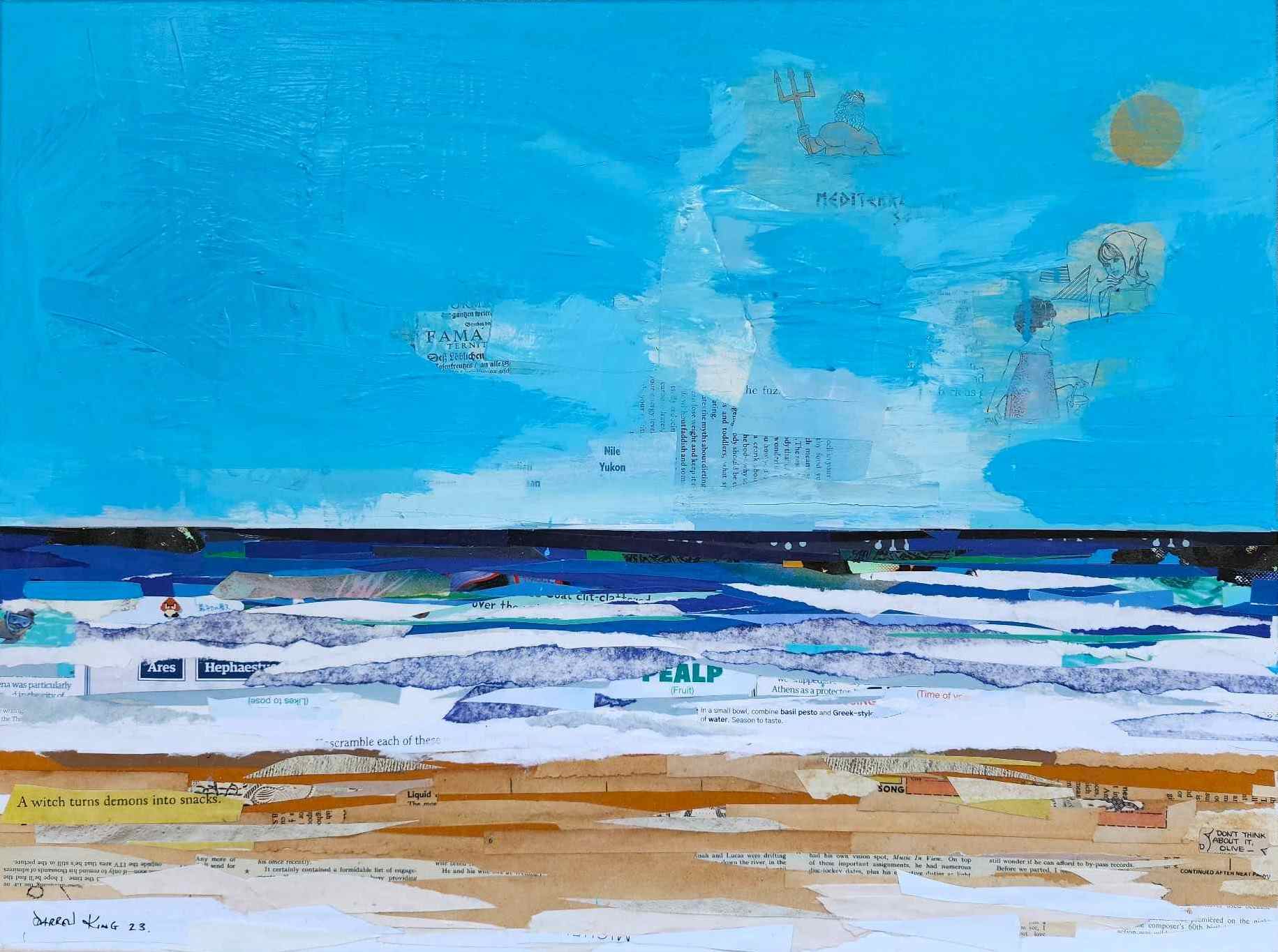The sand and sea have been created from upcycled paper elements. These pieces have been harvested, then cut or torn from various magazines, packaging, books, brochures and junk mail. The sky is paint over collage. Random text and oddities pop up throughout the work, at times covered, at times visible.
