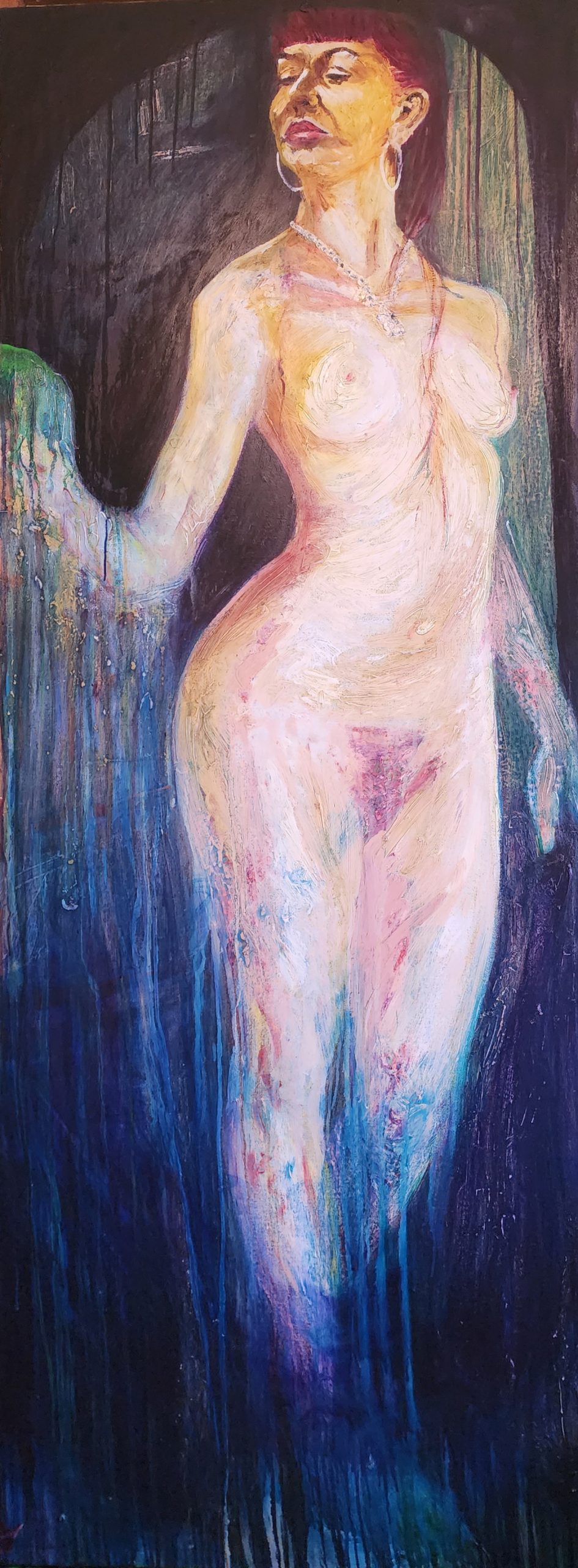 For this work I painted over a work originally from my first Sydney Solo exhibition. The works were a set of three of Maja, my wife and muse under the titles The Three Graces inspired by the works the artist observed whilst visiting The Louvre in Paris which houses several sculptures related to the Three Graces, goddesses of charm, grace, and beauty in Greek mythology. The face on the original work did not do justice to Maja’s beauty and focus.