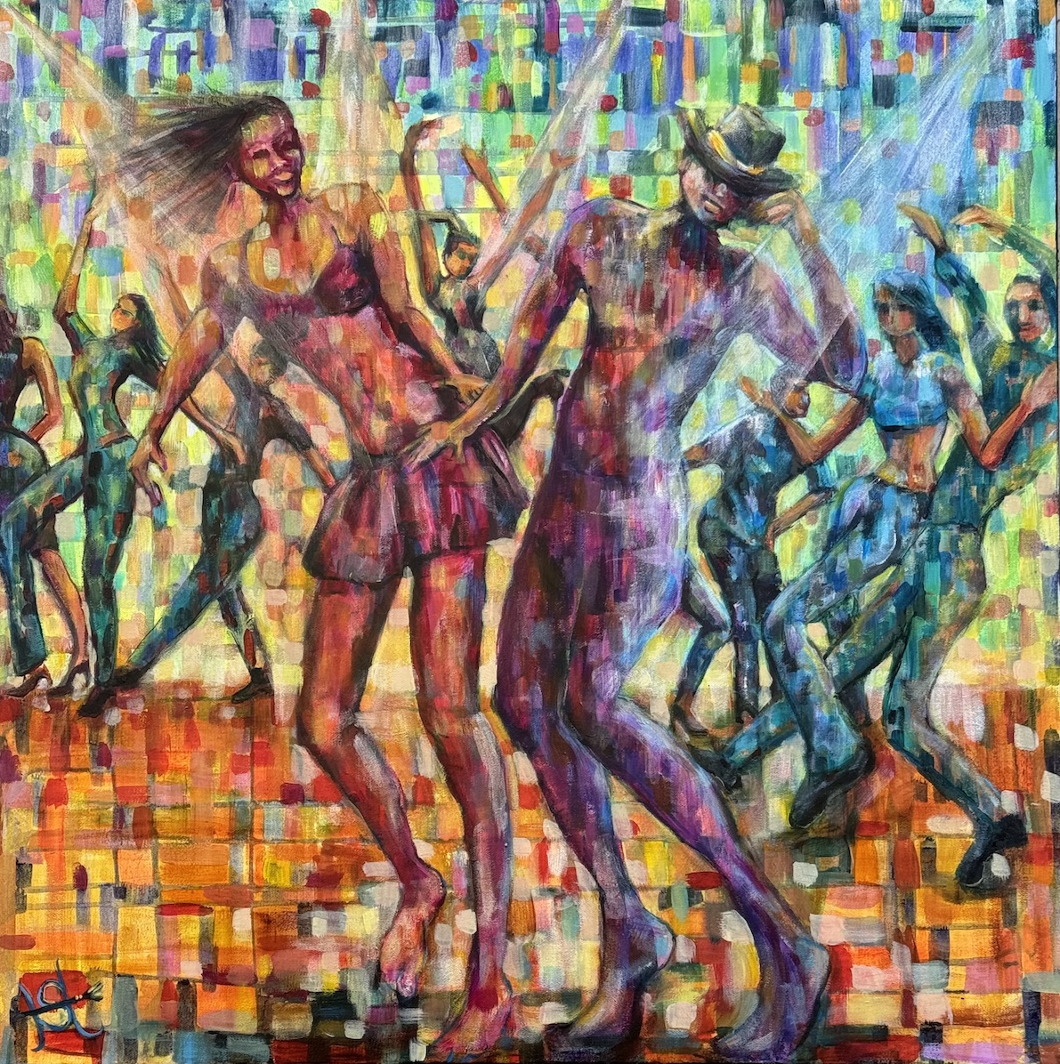 Sue began this canvas by dribbling acrylic inks down the white canvas from all four sides forming a coloured grid.  She filled these rectangular grids with acrylic paint, and from there decided to paint an outline the two main dancing figures, followed by the smaller background figures.   The lights she painted with an Iridescent medium. Sue has attempted to show a staccato-type rhythm by keeping the entire painting in a small patchy format.