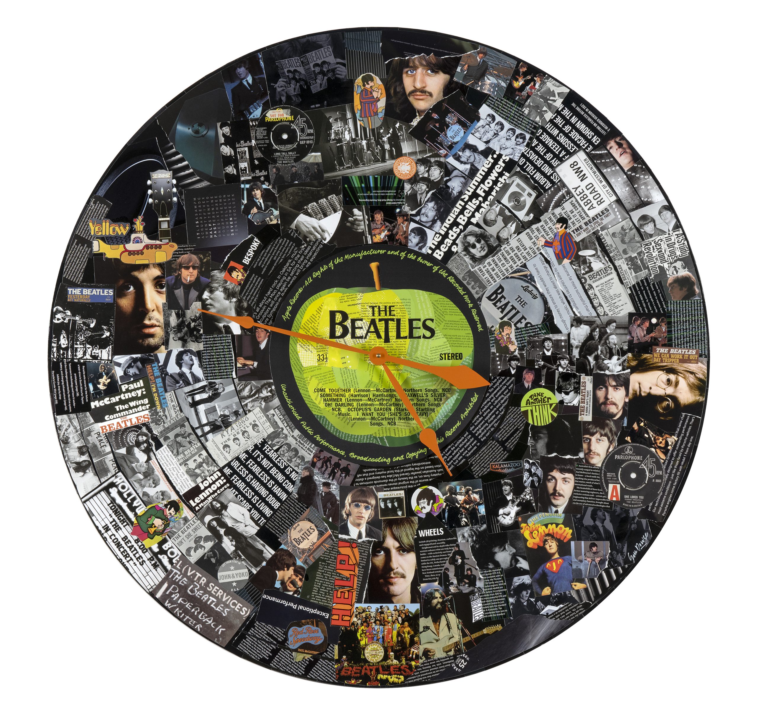 ‘The Beatles Vinyl’ collage has been designed to look like an old record complete with grooves and the shine bouncing off the vinyl. My first collage on a round board has been created solely out of Beatles photos, memorabilia and text. I have also converted the collage into a clock with orange hands and it looks great. Enlarge it to see all the detail!