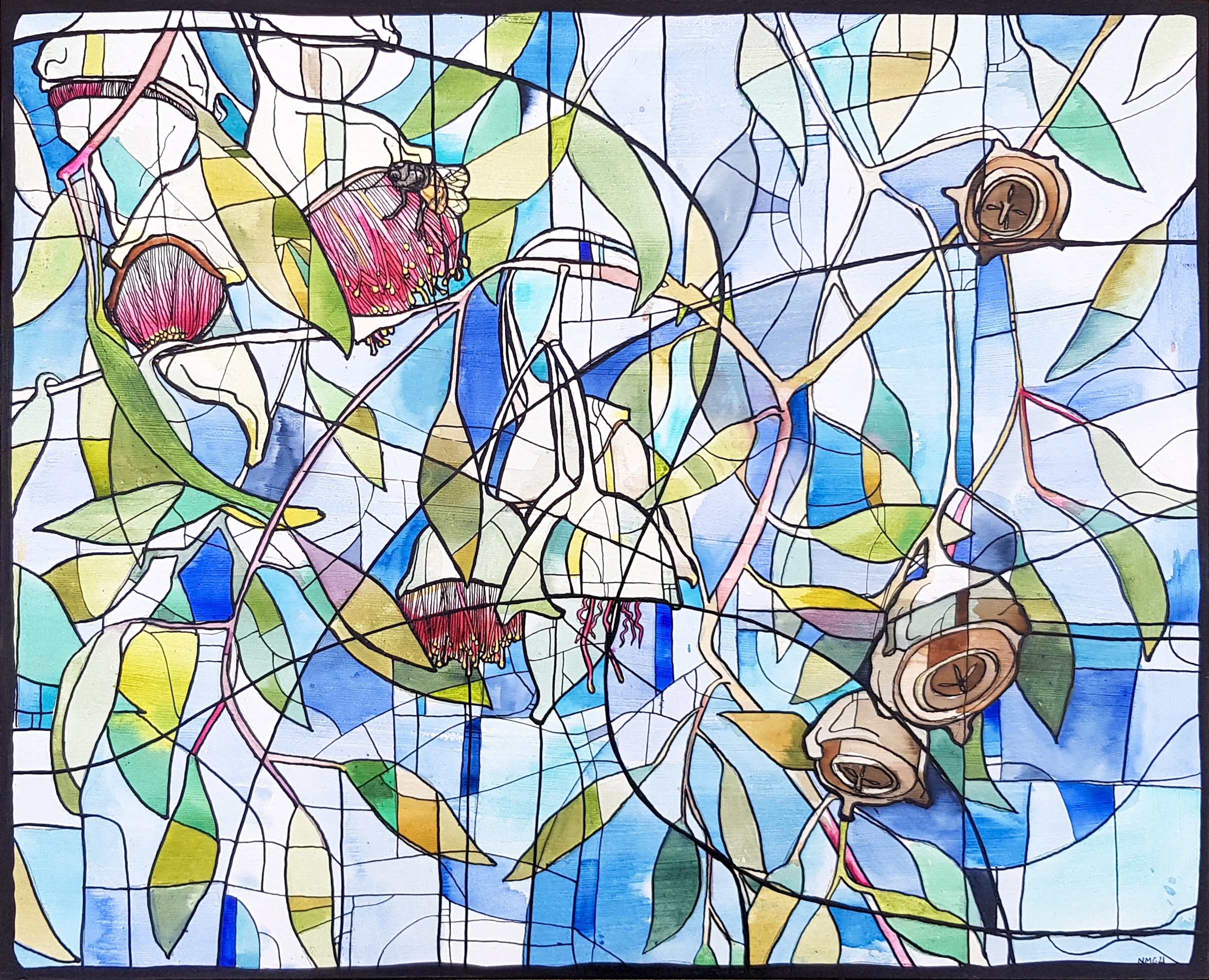 Depicting a little bee exploring the Kingsmill’s Mallee flowering gums. Washes of watercolour are built up with pen and ink linework holding the image together. Reminiscent of stained glass this painting being on a solid wooden frame is ready to hang with the sides painted black.