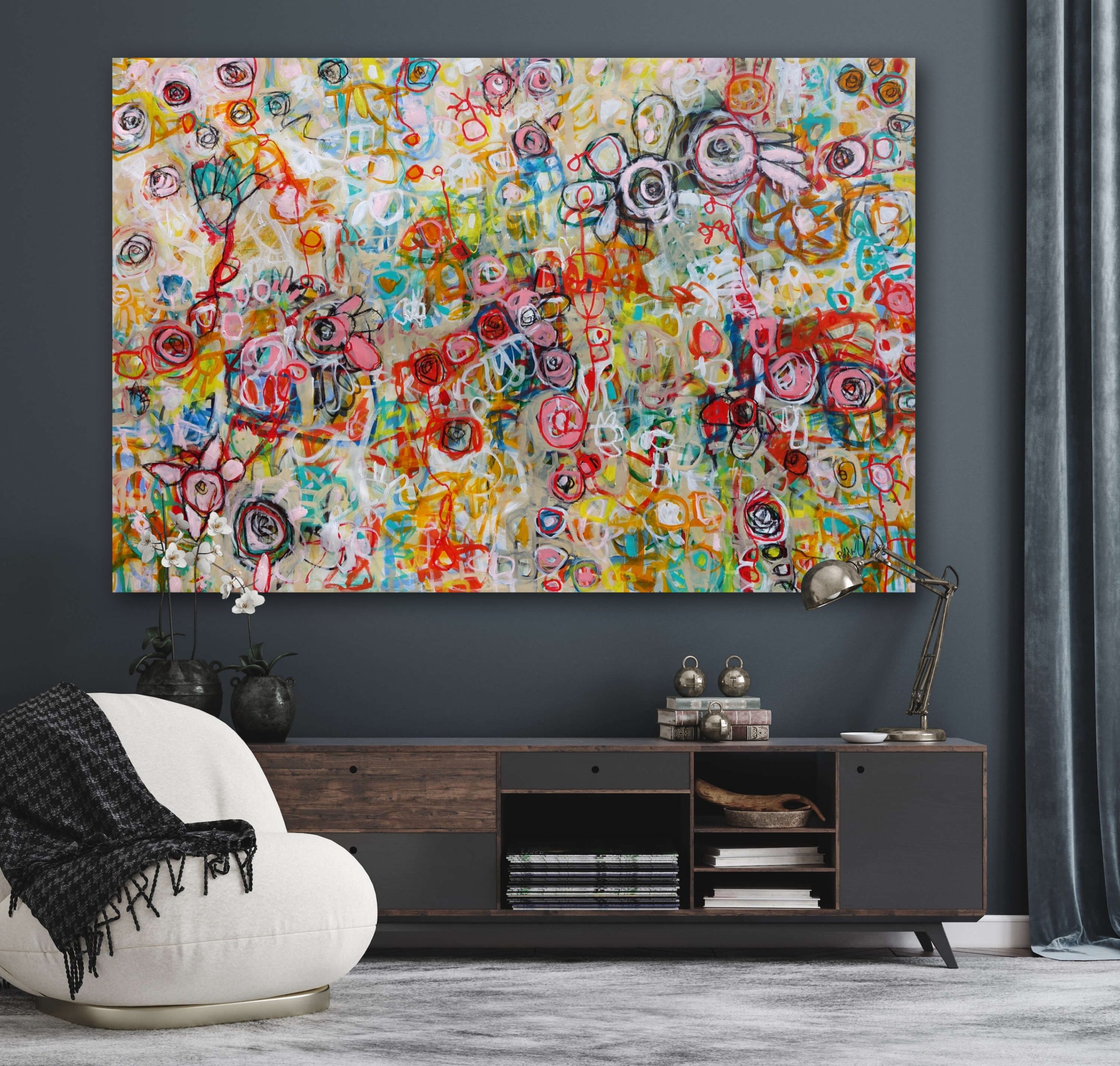 This work is oil and acrylic, 183cm X 120cm on Fine Belgian Linen. The work is sealed with a Gloss Varnish and Signed on the front. Artist CV and Certificate of Authenticity included. The work is painted on the sides so that it can be hung without exterior framing if required.The work is Unstretched and sent in a roll ready for stretching.