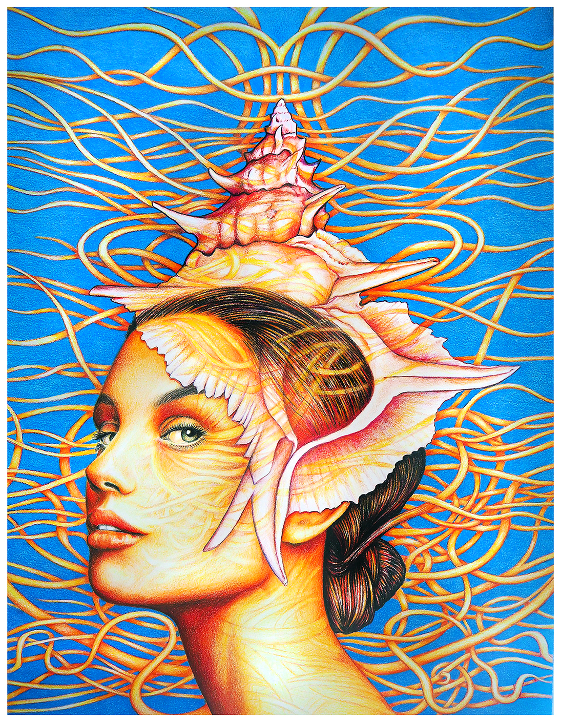 “Siratus Echoes from the Deep” is a large pencil illustration that invites us to remember to reconnect with nature. To listen to the sounds and the energy vibrations of the ocean deep inside the shell that radiate outwards is swirling motions, indicated by the flowing lines. The subject pauses and has complete focus to hear these echoes of past waves and mysterious sounds. Like a time capsual of ocean acoutics coiled up inside the exotic alabster shell. Remember, next time you find a beautiful shell along the beach, pick it up and listen, enjoy the blissful moment and pause in the present.