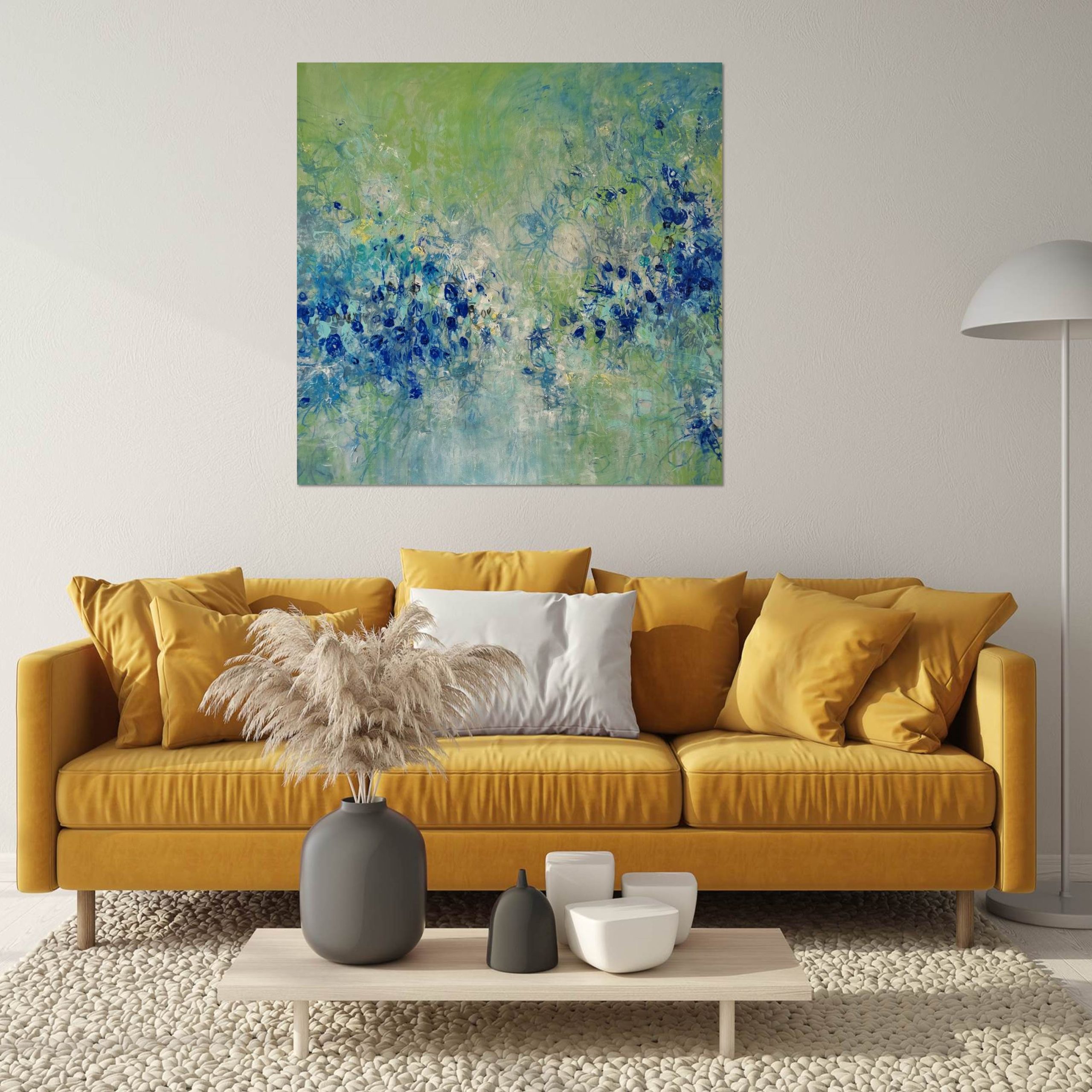 Shades, dilutions and pattern in varied blues, light soft green, turquoise and white contrasted with subtle hints of mid yellow. Featuring expressive and gestural brushwork, this painting is a contemporary and ambient original artwork in calming cool and neutral tones.