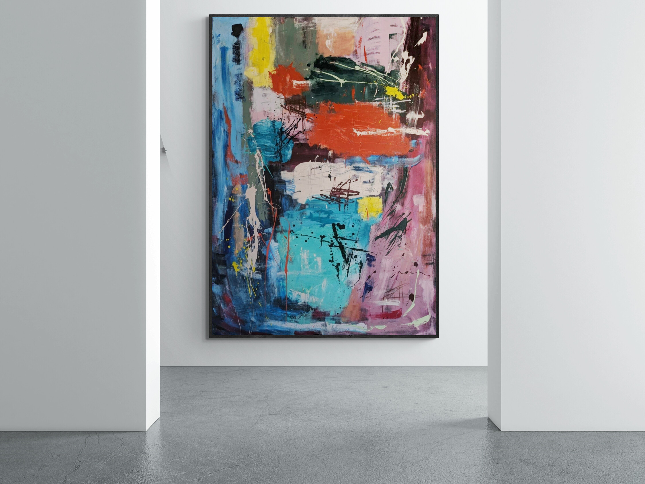 This beautiful modern piece is made with lots of layers of texture and drips of acrylic paint. It was sprayed with varnish for a protection of color.