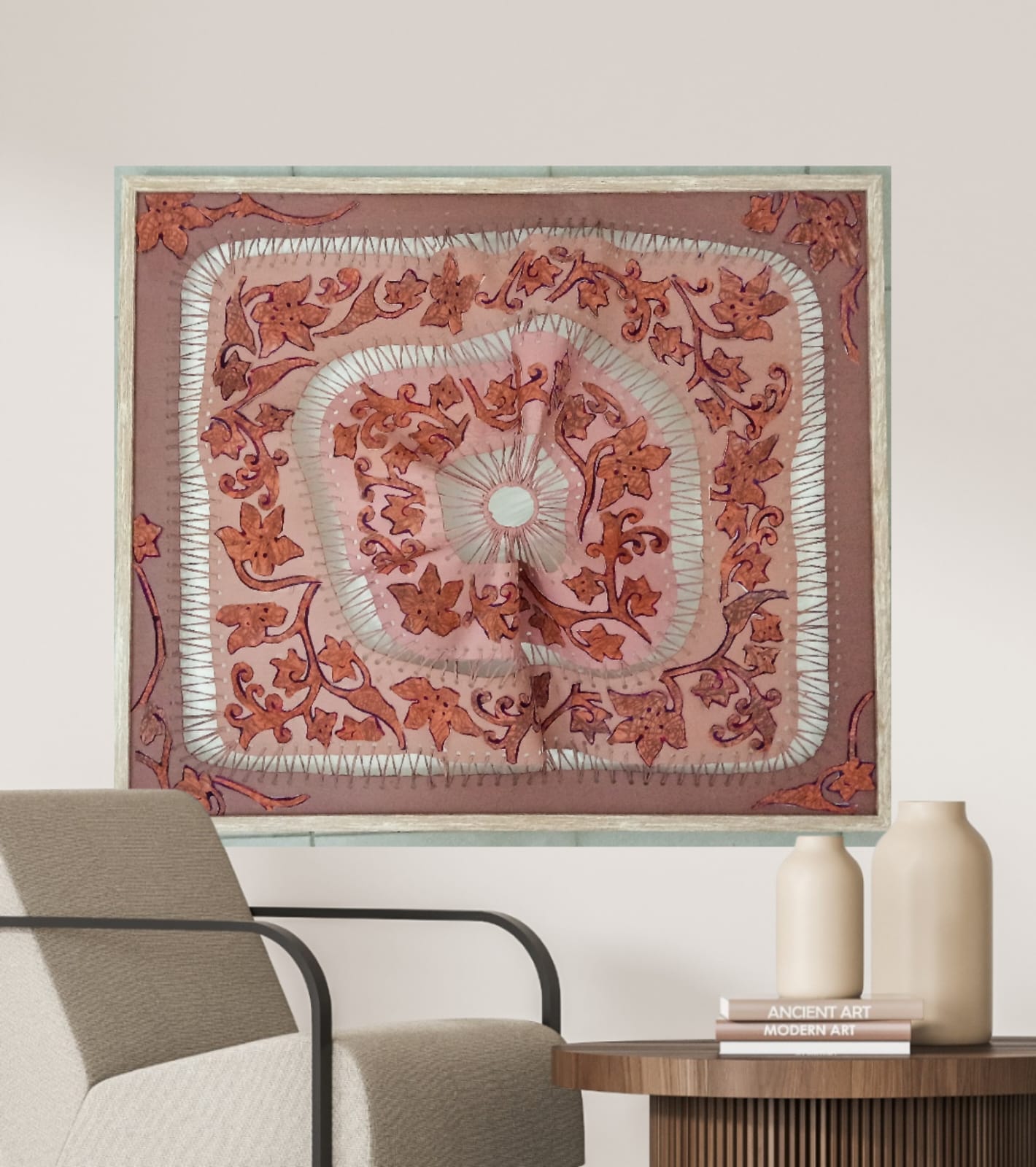 the canvas is transformed into dynamic, organic shapes that extend beyond a flat surface. This tension-based method results in textured, sculptural forms that emphasize resilience and reinvention, blending traditional art practices with innovative fabric manipulation. embodies the transformation of destruction into art, through innovative experimentation and boundary-pushing. This process highlights the beauty of rebuilding, celebrating resilience and the elegance of reconstructed imperfection.”