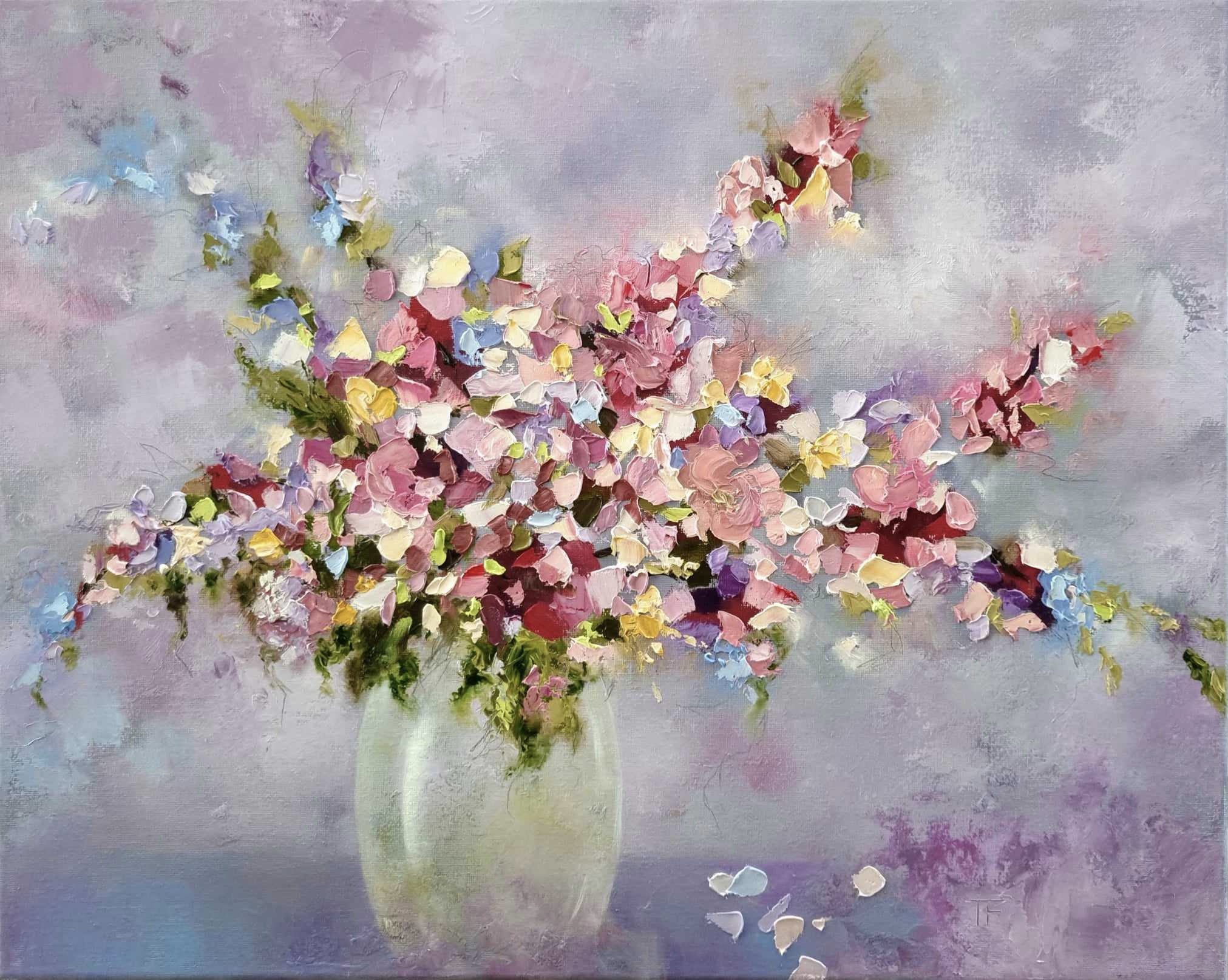 This contemporary painting features an expressive bouquet of flowers created with palette knife and thick impasto oil paint. While I didn’t intend to depict any specific floral arrangement, the focus was on the interplay of colors merging seamlessly. The vibrant hues within the floral composition contrast harmoniously against the softer background, creating a vivid yet serene ambiance.