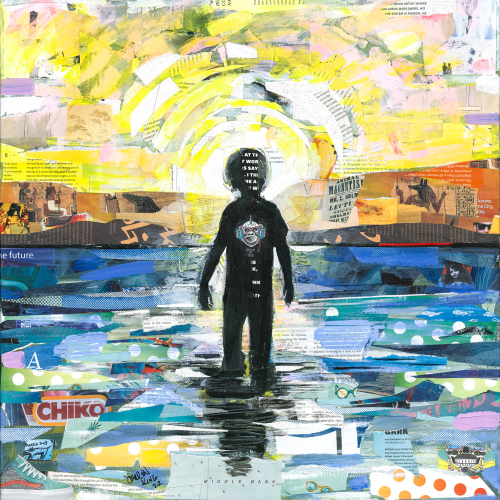 Based on the original collage and paint artwork on canvas. This image is based on a series of photos I took of my son standing in Lake Illawarra after a failed mid winter fishing trip. Both fishermen were clueless, so my son ended up drenched in the water as the sun set behind him over the Illawarra escarpment. I have created several artworks based on this day.