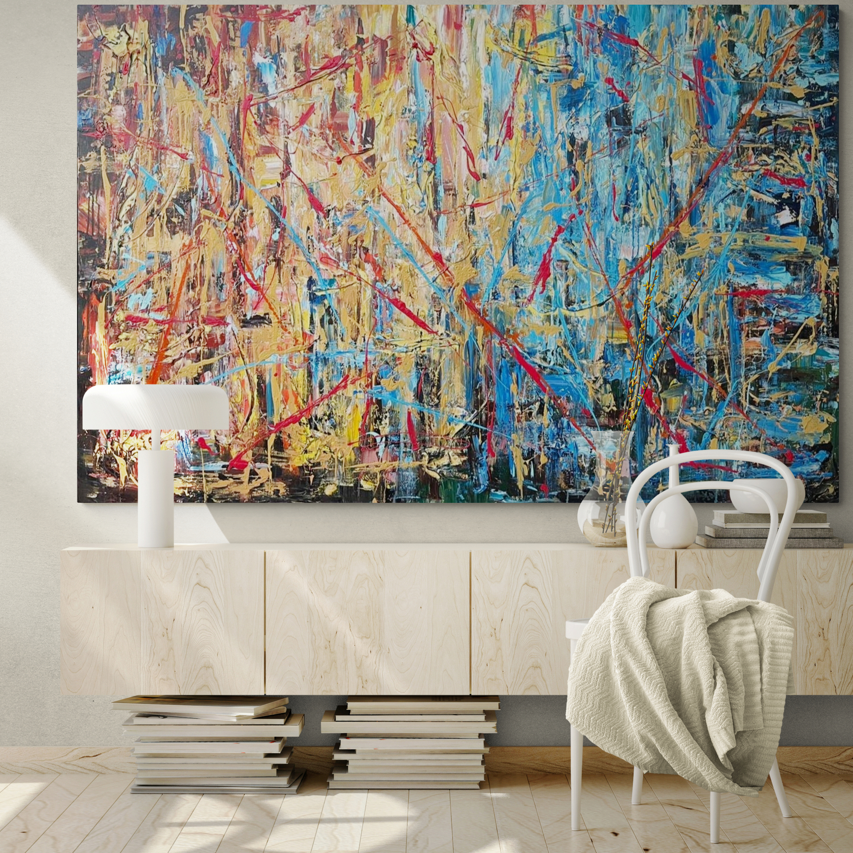 This beautiful modern piece is made with lots of layers and drips of acrylic paint. It was varnished for a protection of color. It has a wire at the back and is ready to hang. Signed with a certificate of authenticity.