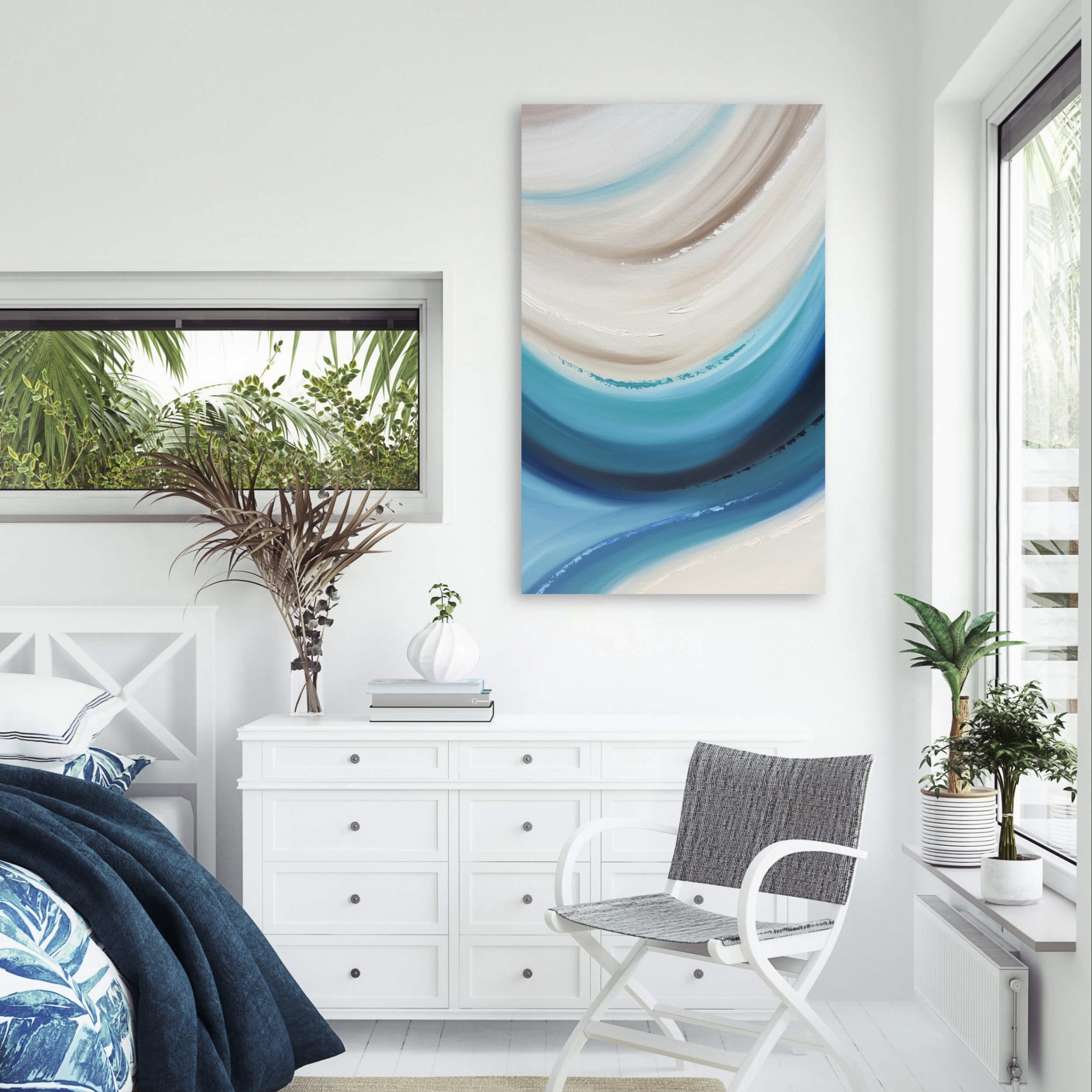 Soft, sweeping curves of aqua, sand, and cloud-white flow together in The Calm Within, evoking the soothing rhythm of waves that linger in memory long after the tide has retreated. Each brushstroke feels like a whisper from the past, a moment of stillness on a quiet beach, the warmth of sun on skin, the gentle hush of the ocean reminding us to breathe.